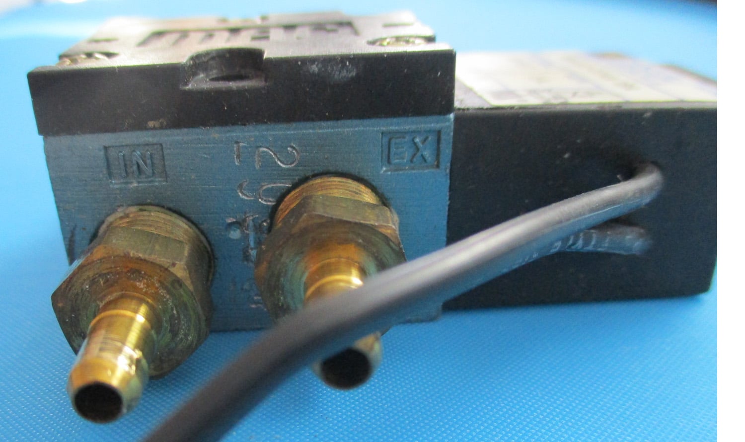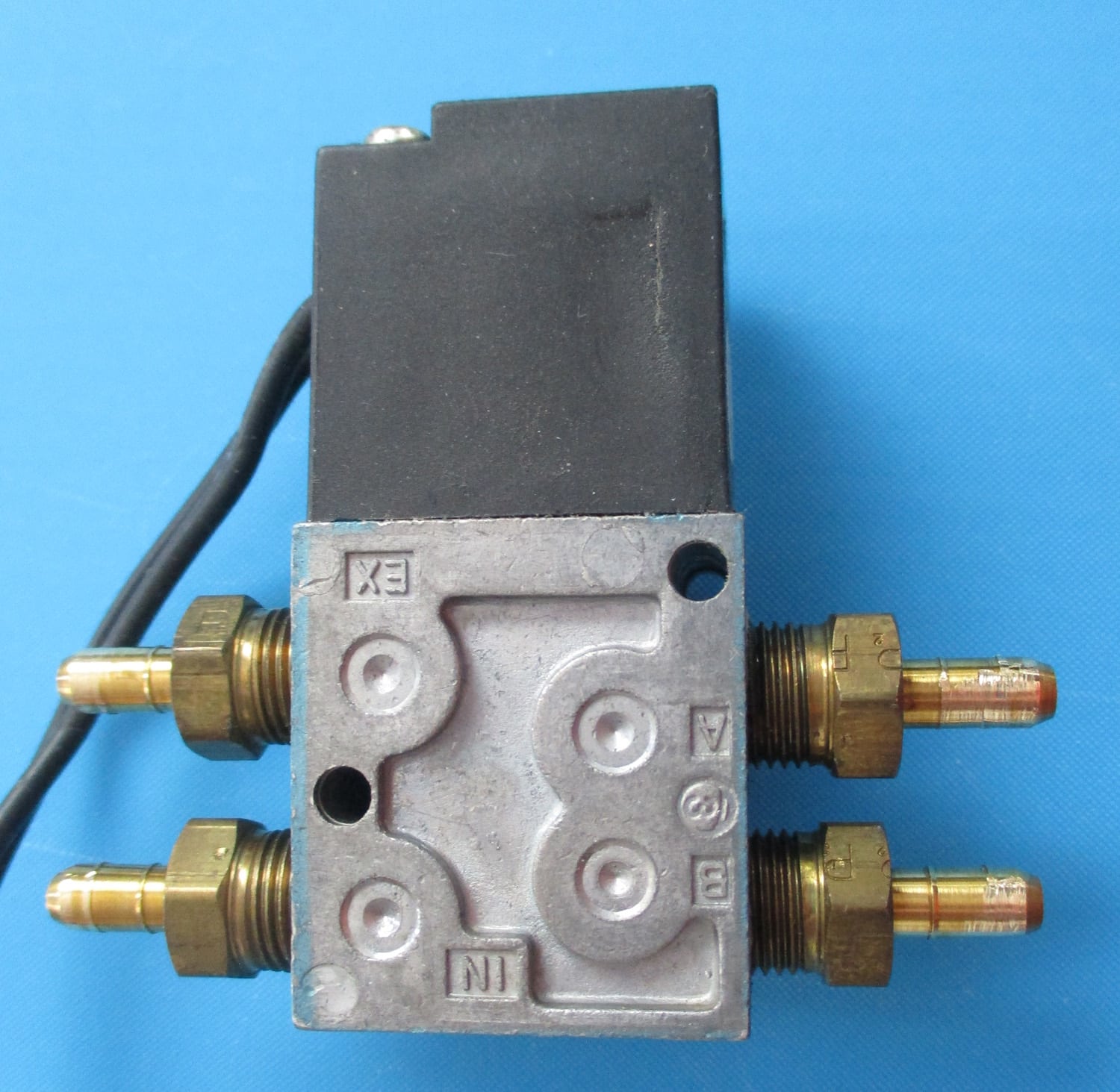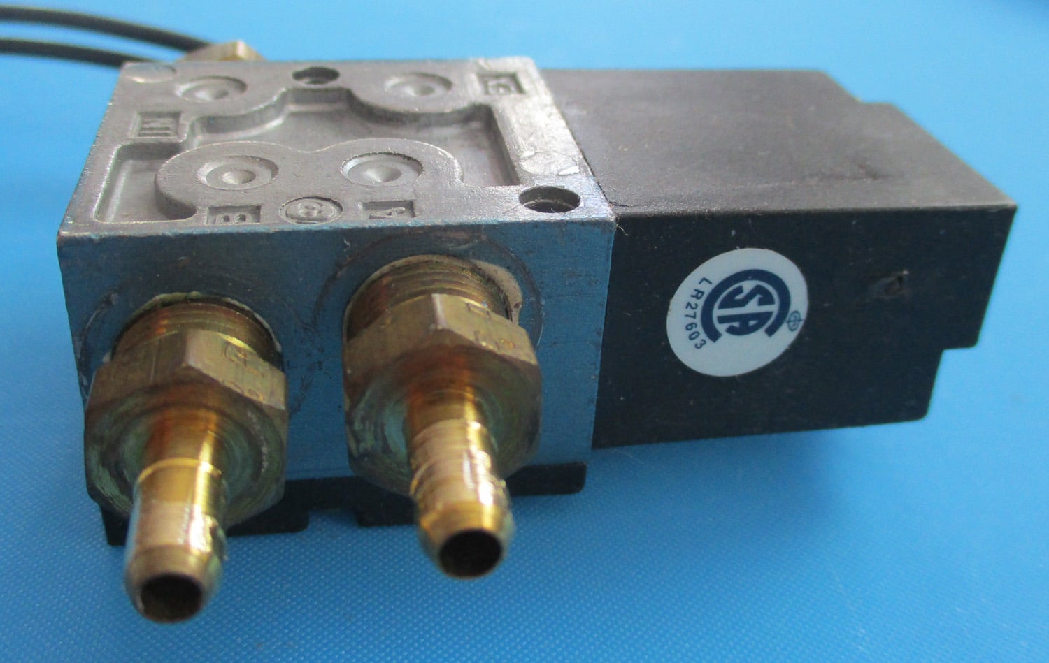 USED  This plastic and metal MAC air shift valve is 2 7/16″ long and 15/16″ high. The plastic body is 1 3/16″ wide and the total width, including the nipples, is 2 3/4″. The brass connectors are 13/16″ long, including the slip-fit barbed nipples. The nipples are 3/8″ long with a 3/16″ outside diameter and a 1/8″ inside diameter. The plastic-covered wires are 6″ long.