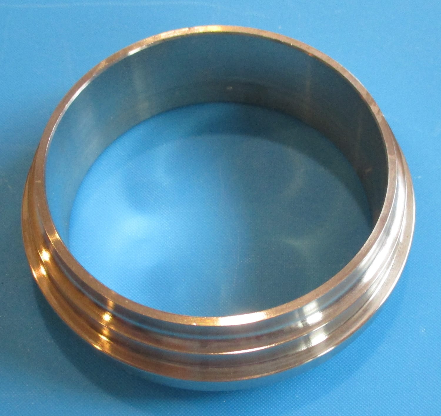 NEW This stainless steel Meltec 2 1/2″male Weldon bevel seat is 7/8″ high with a 2 7/8″ outside diameter and a 2 3/8″ inside diameter. The beveled end is 3/16″ high with a 2 7/8″ outside diameter. Each of the tiers is 3/16″ high. One has a 2 7/8″ outside diameter, one has a 2 11/16″ outside diameter and one has a 2 1/2″ outside diameter.