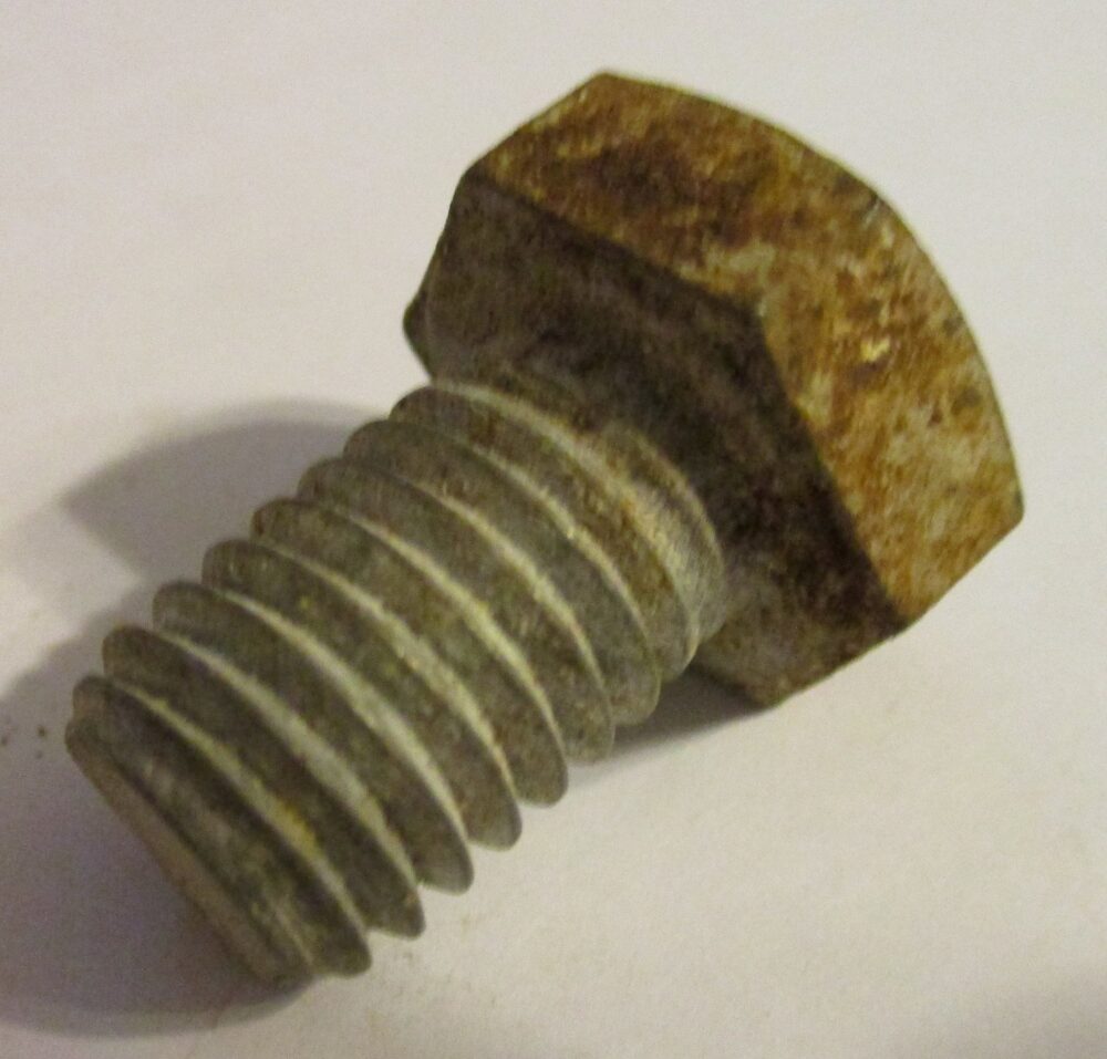 USED This metal hex bolt is 1 1/16″ long. The 5/8″ long threaded length has a 1/2-13 thread size. The hex head is 13/16″ wide. This bolt is sold as a package of nine (9). The manufacturer and part number are unknown.