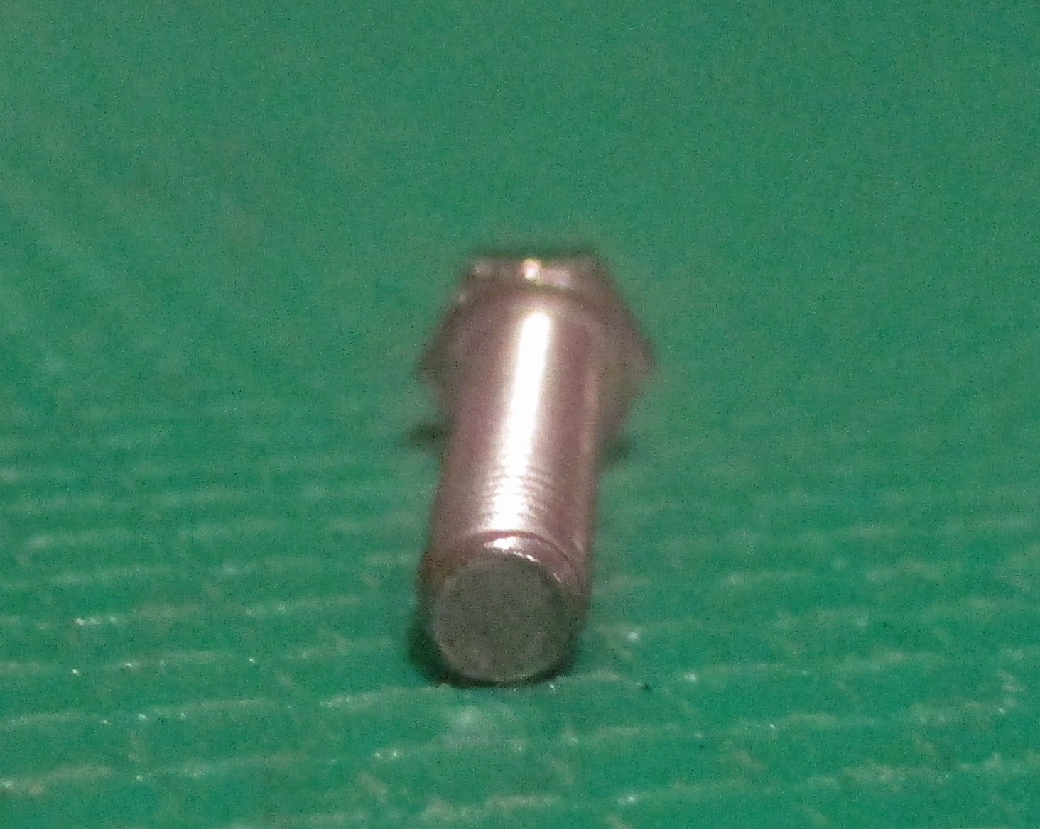 15/16″ long overall. The head is 3/16″ wide by 1/16″ high. The thread has an outer diameter of 1/8″, and a thread size of 8-32.