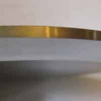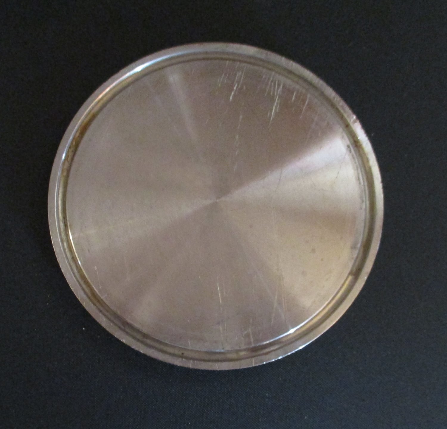 USED  This Westfalia stainless steel end cap fits a 3″ pipe.  It has an outside diameter of 3 9/16″ and has an inside diameter at the underside groove of 3 3/8″.   The center height of the cap is 1/4″ and has a beveled edge.