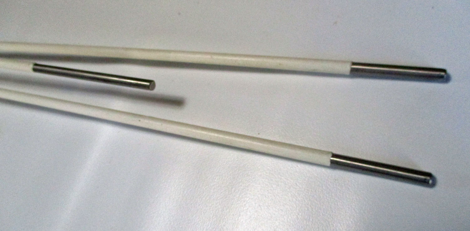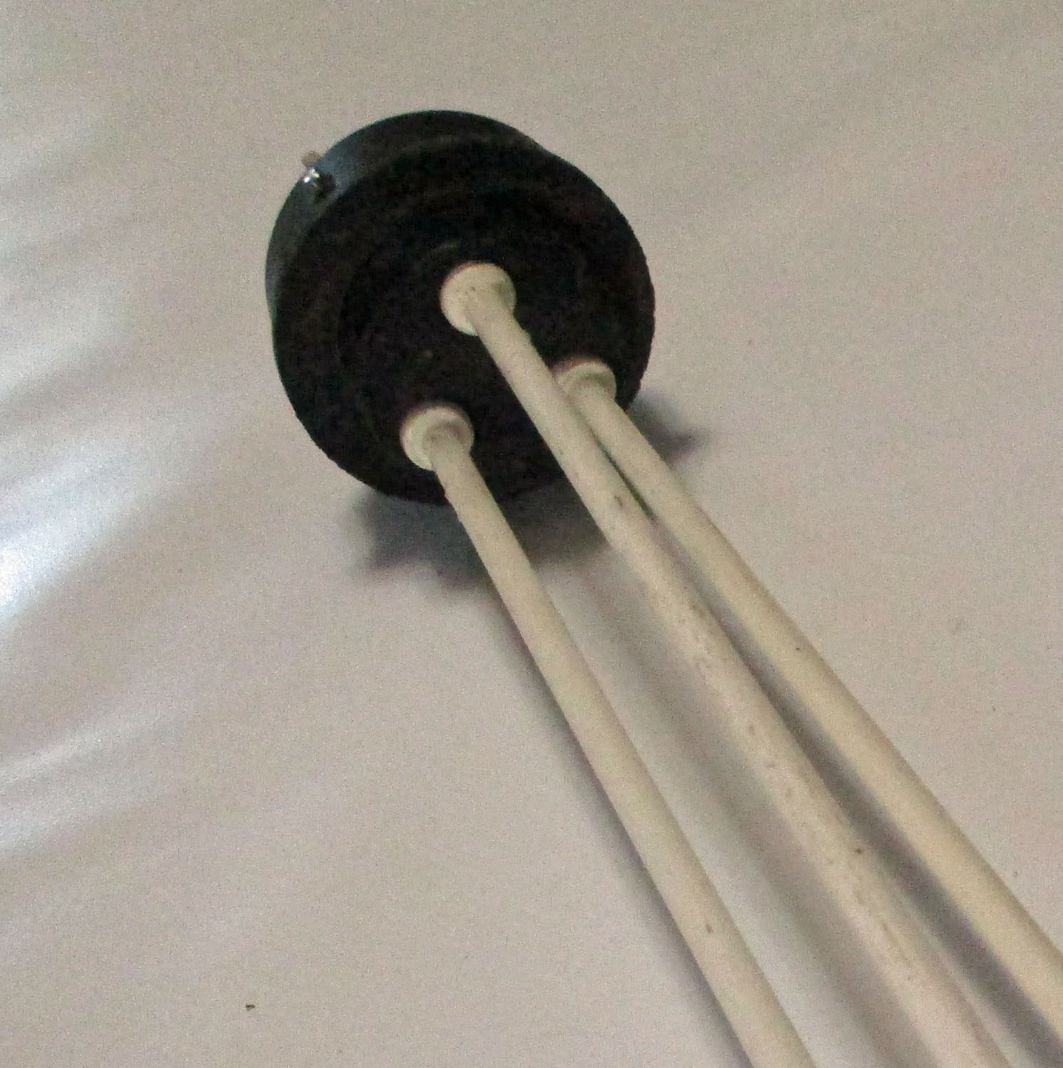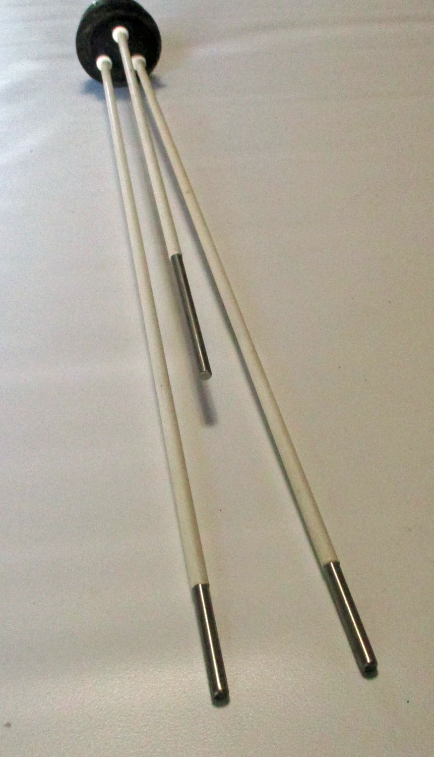 USED This rubber cap holds three stainless steel probes. The 2 1/8" long cap has an outer diameter of 2" and an outer diameter of 1 1/2" on the trap lid side. Two probes are 17 1/2" long and one is 13" long. All three probes have an outer diameter of 3/16" and 1/4" where they are coated. The wires on the cap have been cut off short.