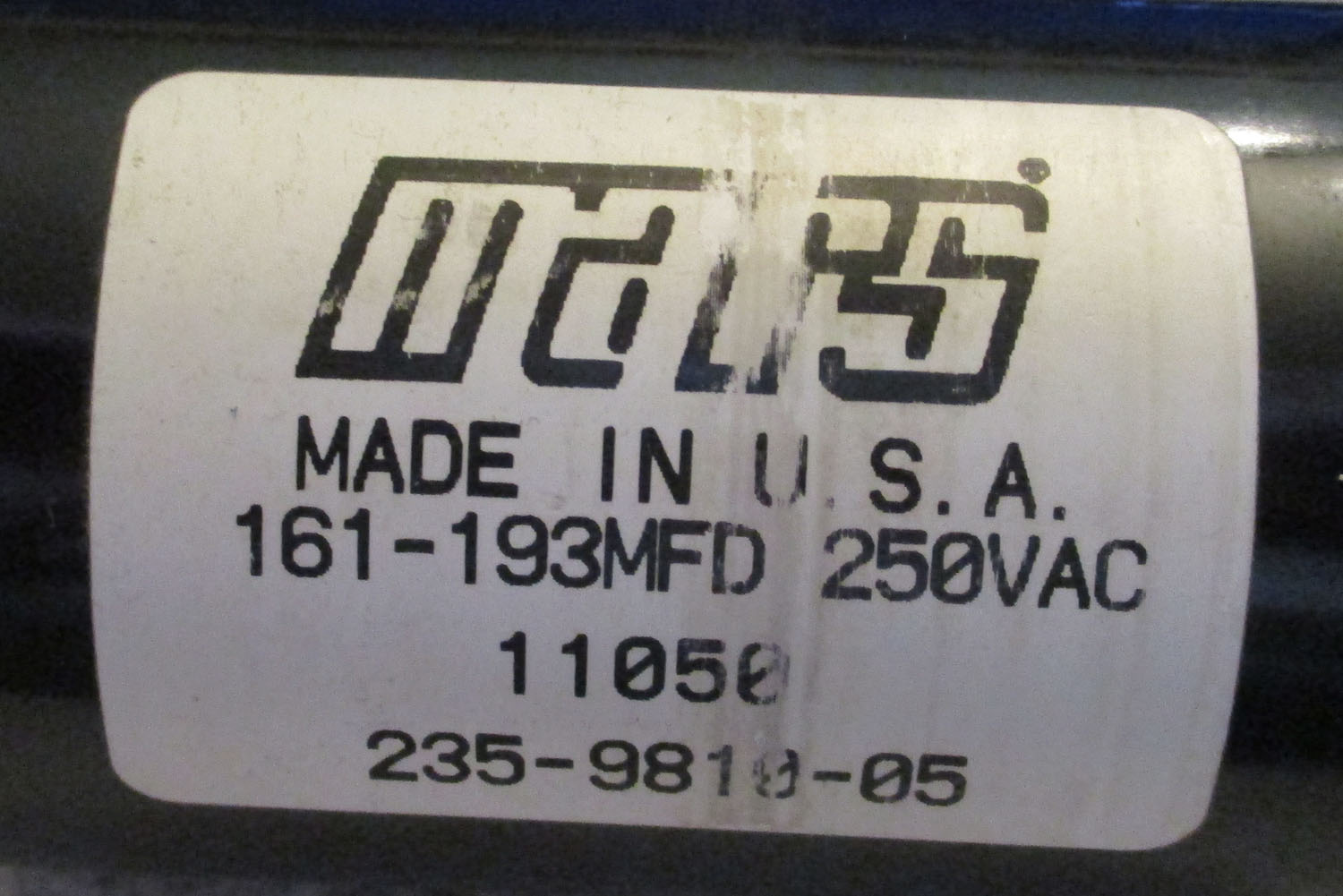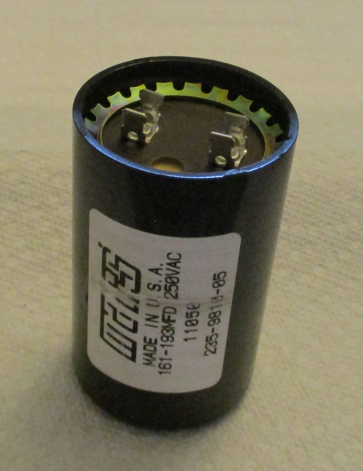 USED This run capacitor is made of metal and plastic. It measures 3 5/16″ tall with an outer diameter of 2″. The prongs are 5/16″ long. The indicated specifications are: