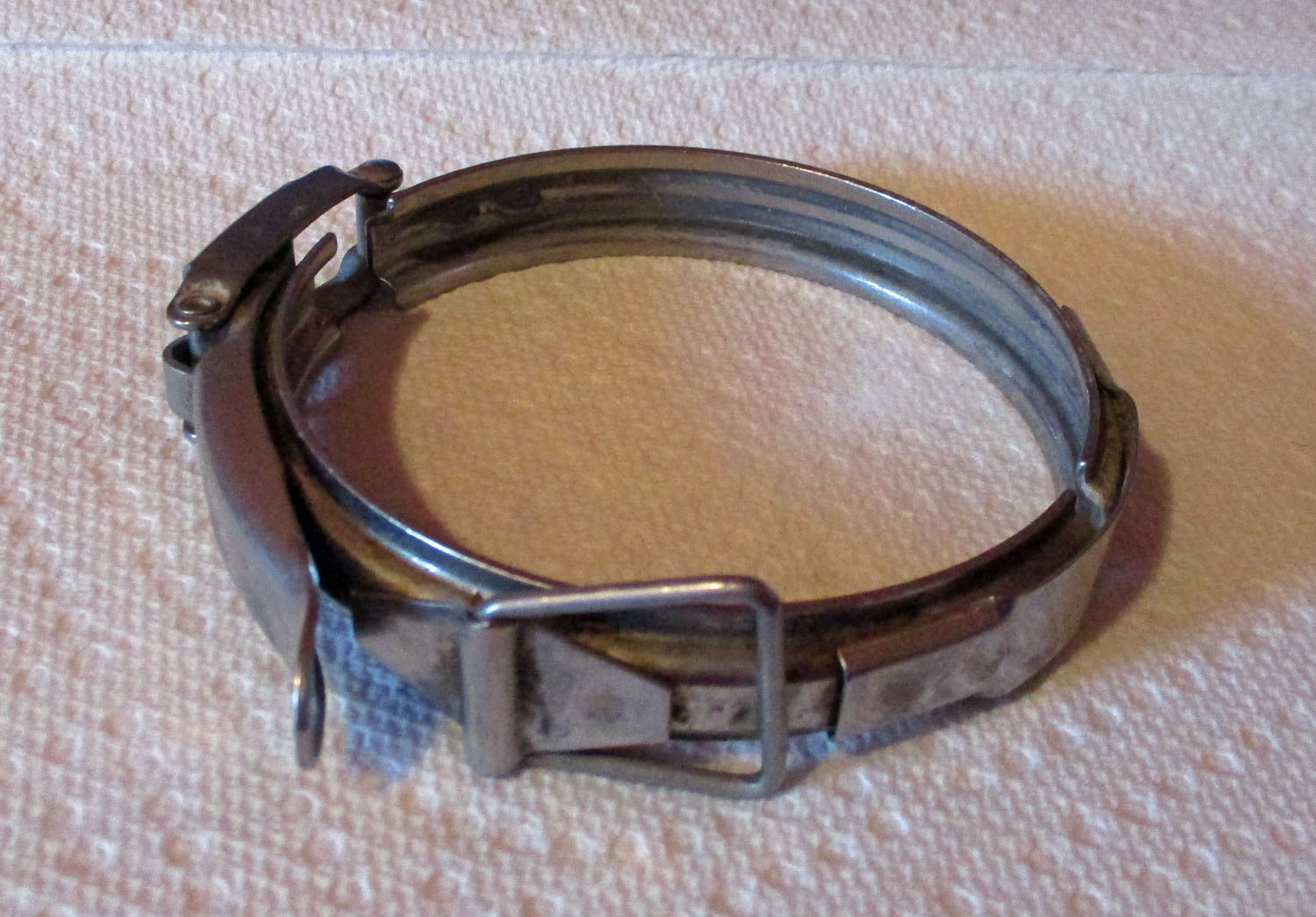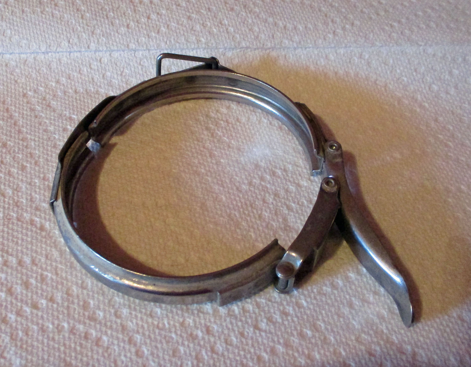 USED This stainless steel snap clamp for a 3″ pipe has an inner diameter of 3 3/8″ when closed. There are two different styles, as shown in the photos. They are sold individually. This type of clamp is also referred to as a toggle or buckle clamp. The manufacturer and part number are unknown.