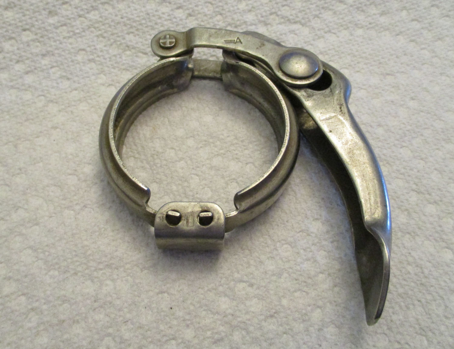 USED This metal 1 1/2″ pipe snap clamp has an inner diameter of 1 11/16″ when closed. The short rod that locks it in place is missing as shown in the photos. This type of clamp is also referred to as a toggle or buckle clamp. The Boumatic part number is unknown.