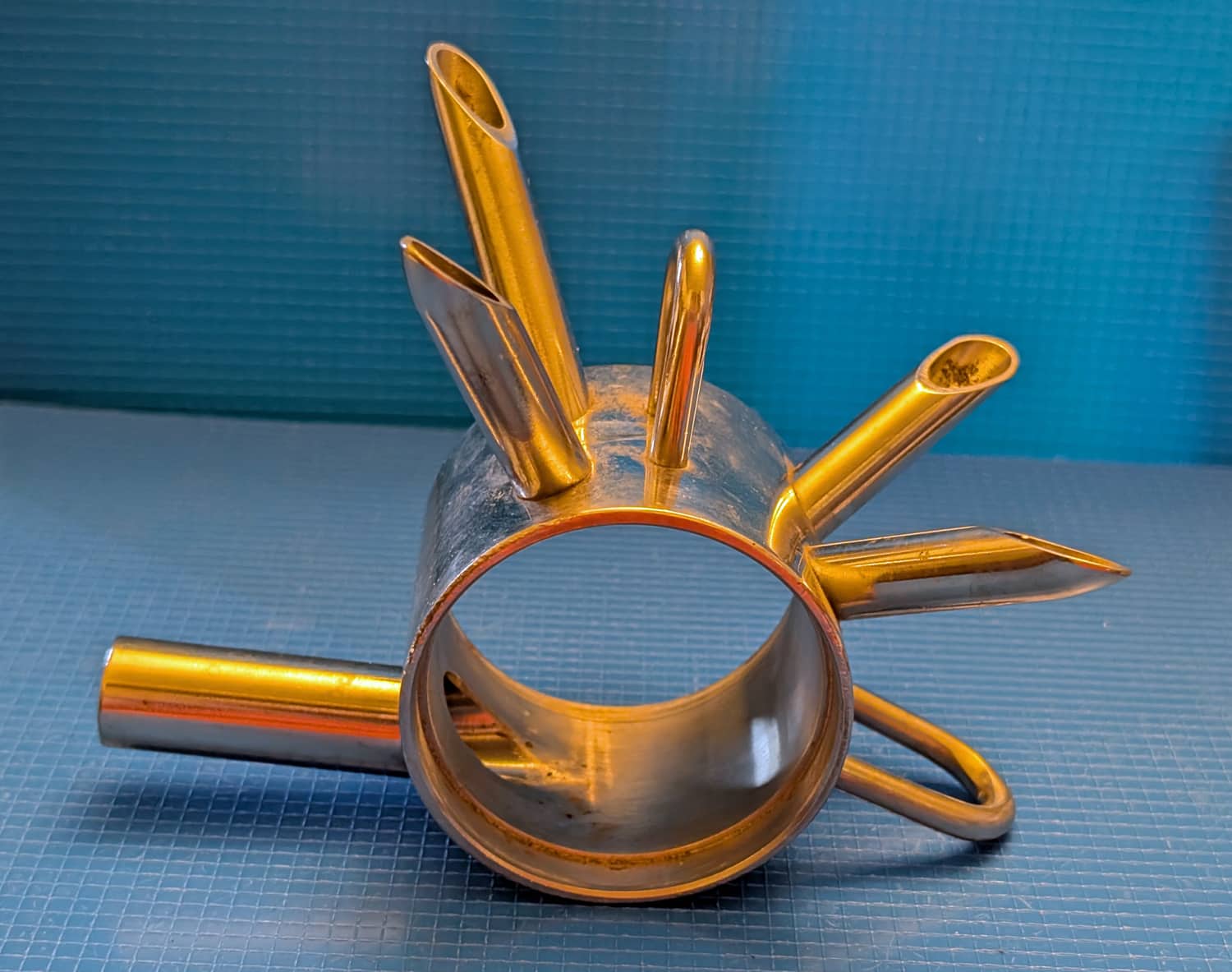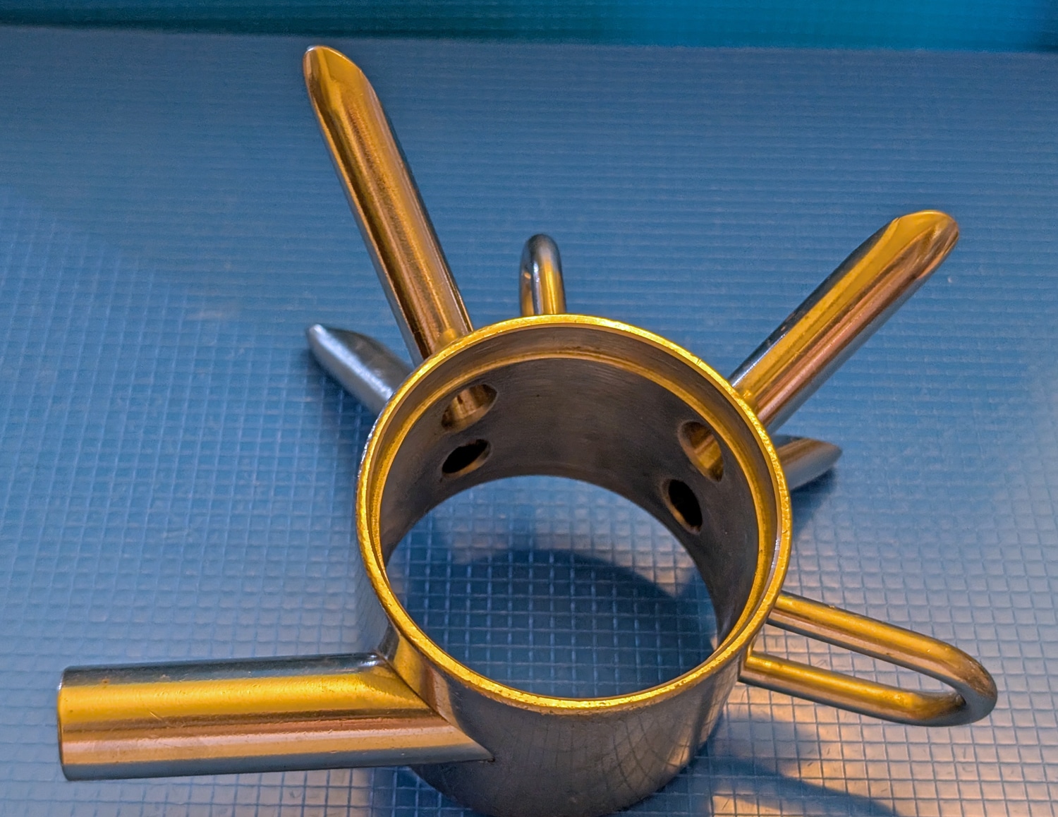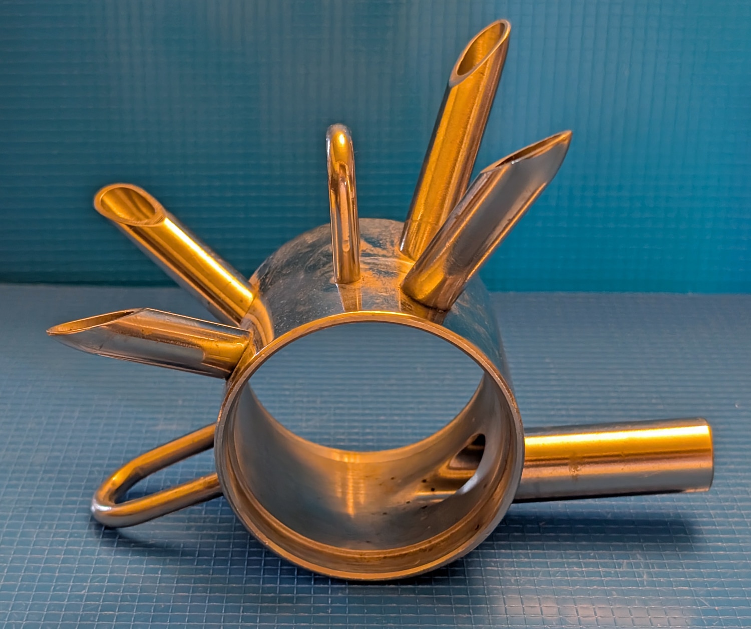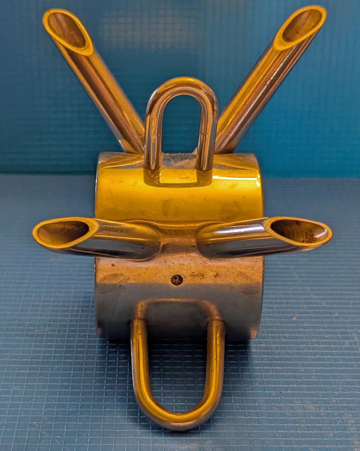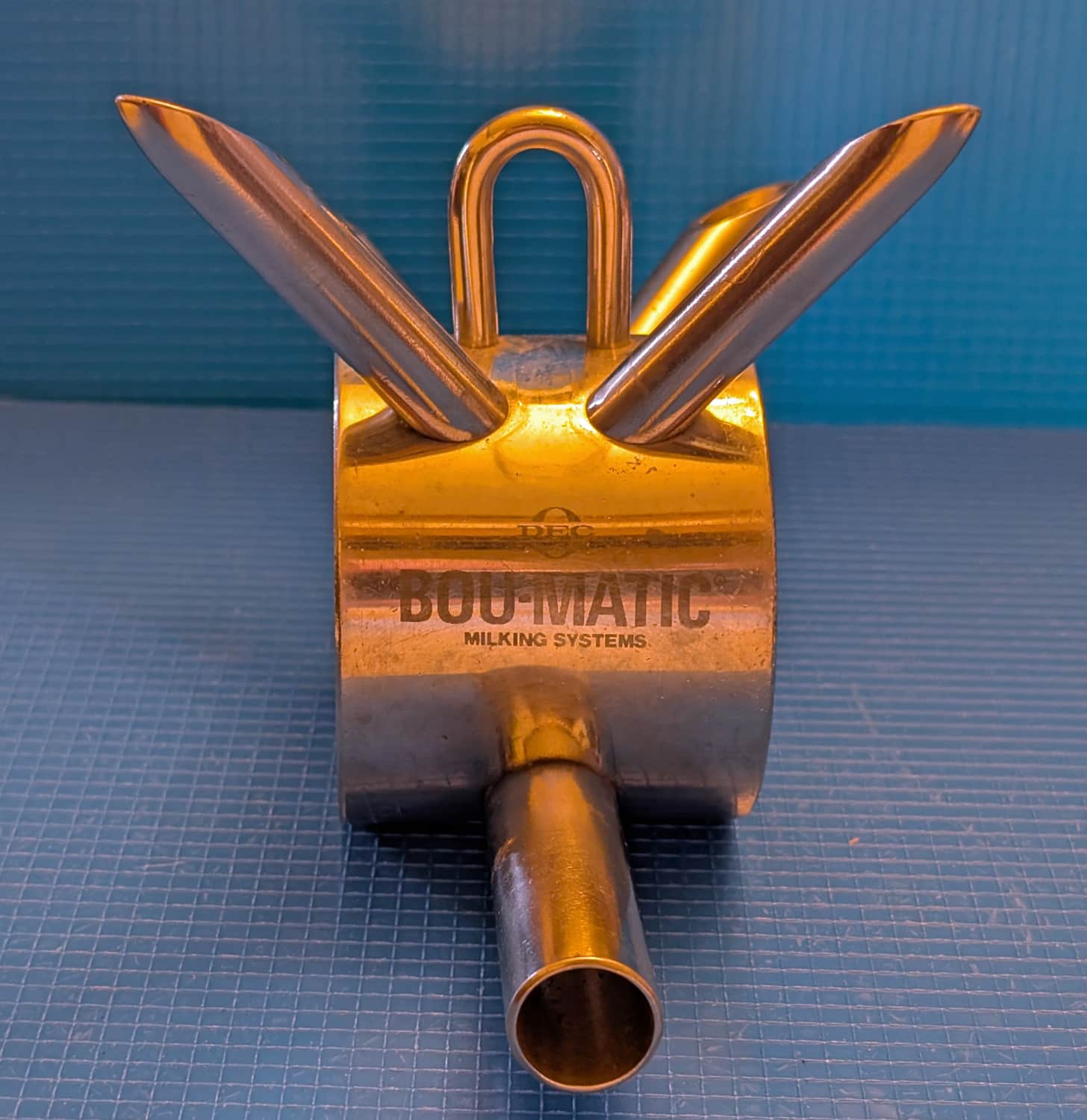 USED This stainless steel Boumatic bottom-unload claw has no windows. The body is 2 3/8″ long with a 2 13/16″ outside diameter and 2 5/8″ inside diameter. The nipples have a 1/2″ outside diameter and are 2 1/8″ to 2 7/16″ long.