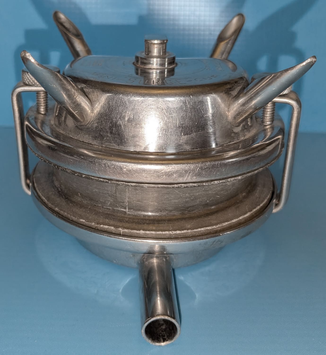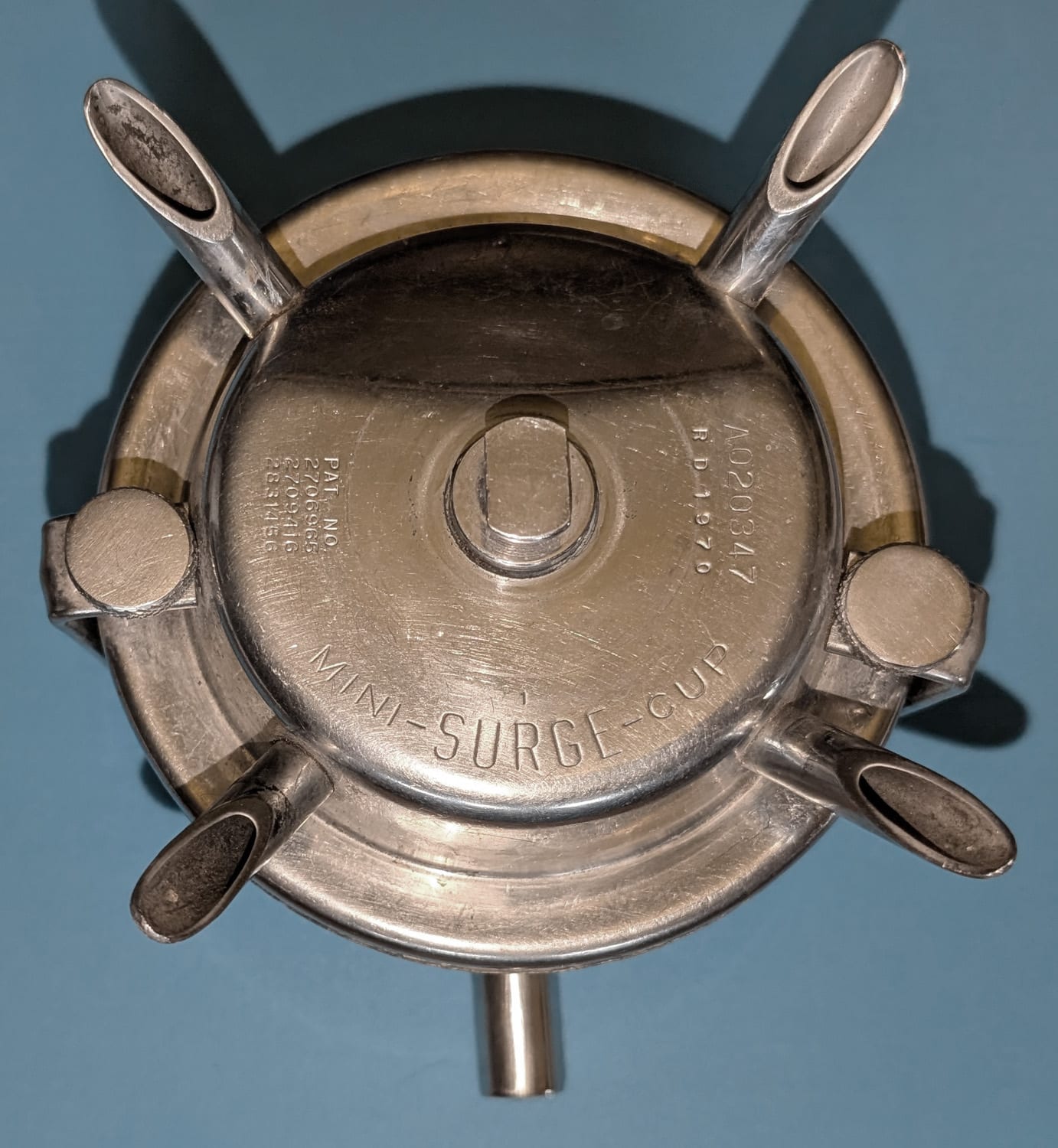 USED This is a Surge Minicup with no air divider or shut-off. This unit has new-style a plastic bowl. This unit has the shorter outlet. It is an earlier model claw. The Surge part number is 7750-0020-580.