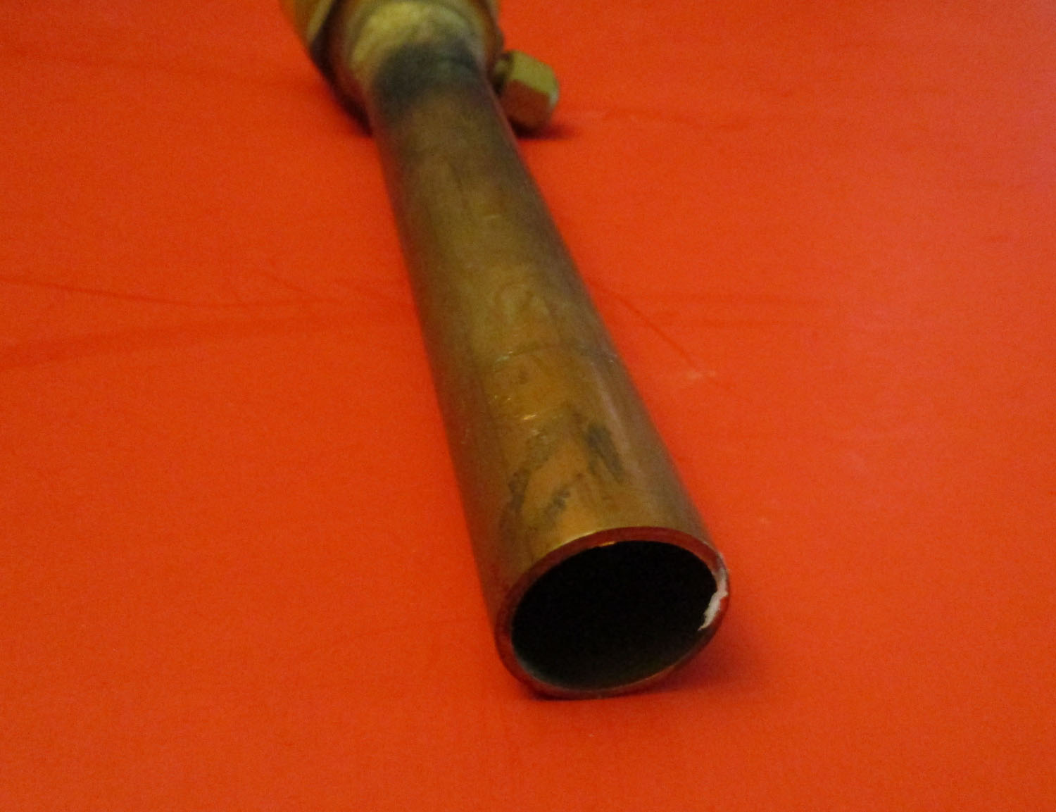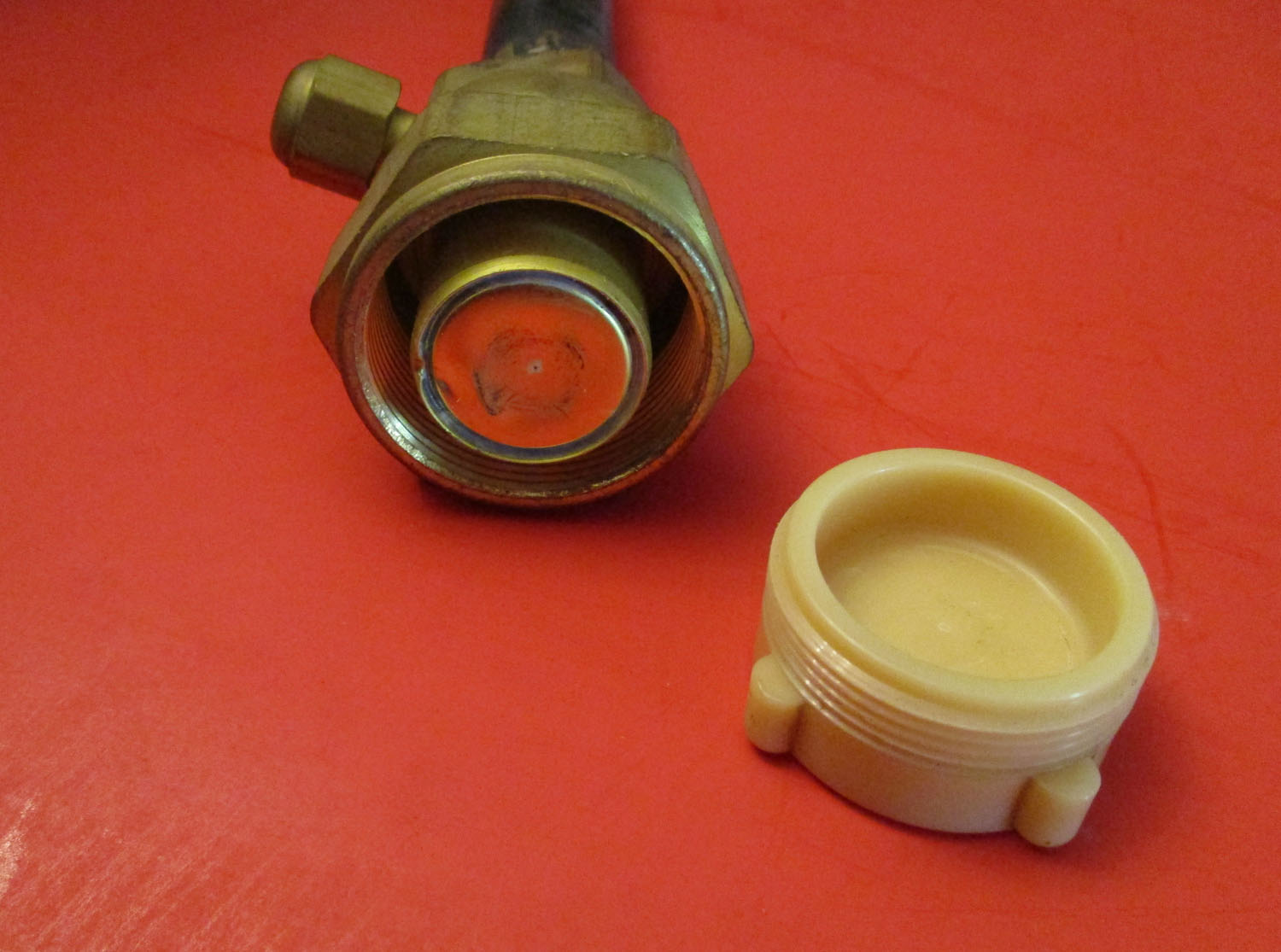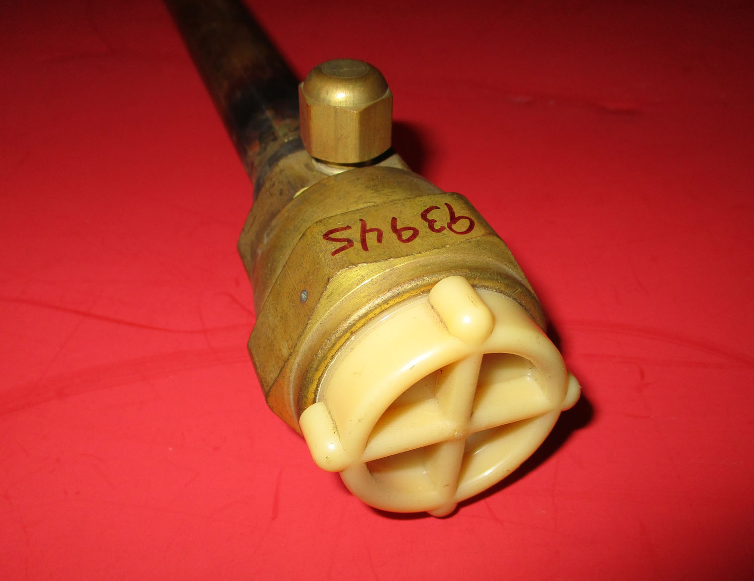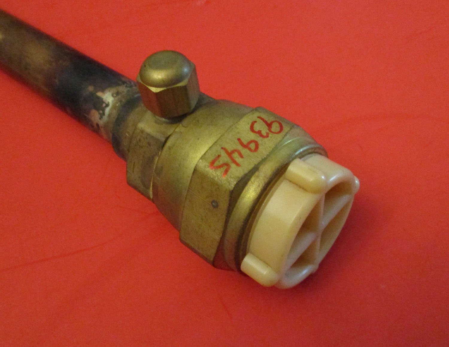 USED This is a liquid line connection that measures 8 1/2″ long. At it’s widest point it measures 2″. The plastic top measures 1 5/16″ for the outer diameter. It is made of copper, brass, and plastic. The part number is 93945.