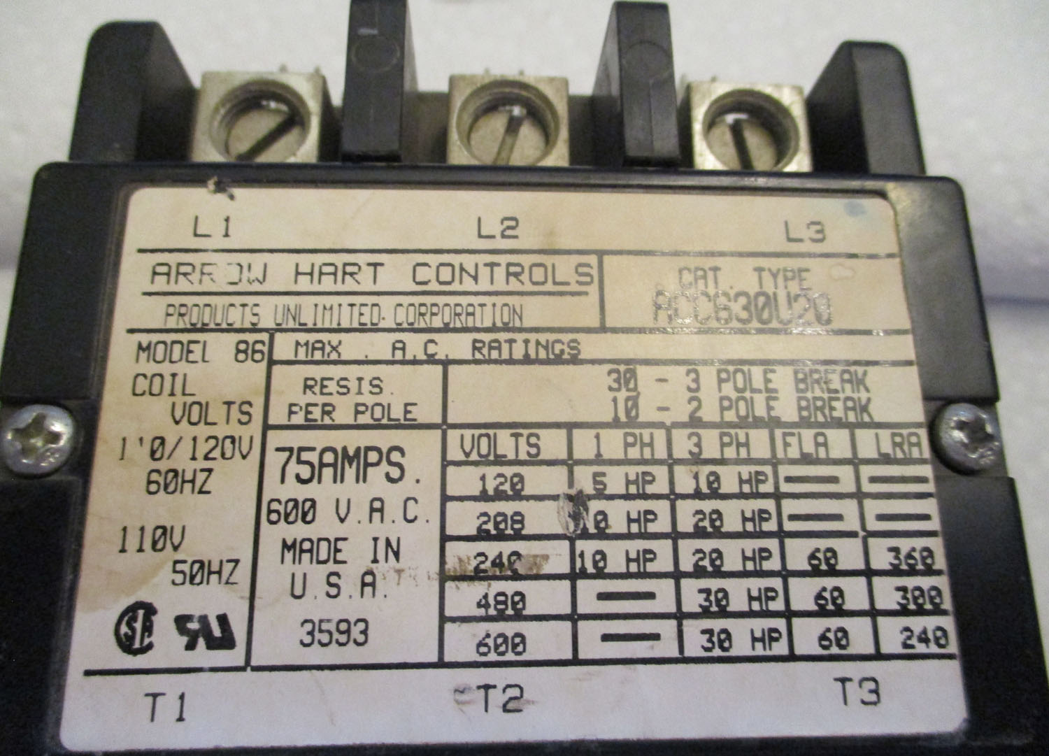 USED This three-pole contactor is made of metal and plastic. The overall dimensions are 4″ tall by 4 7/8″ wide by 3 11/16″ deep. The contactor operates at 75 Amperes 600 volts AC. The Arrow Hart Controls part number is ACC630U20. The indicated specifications are: