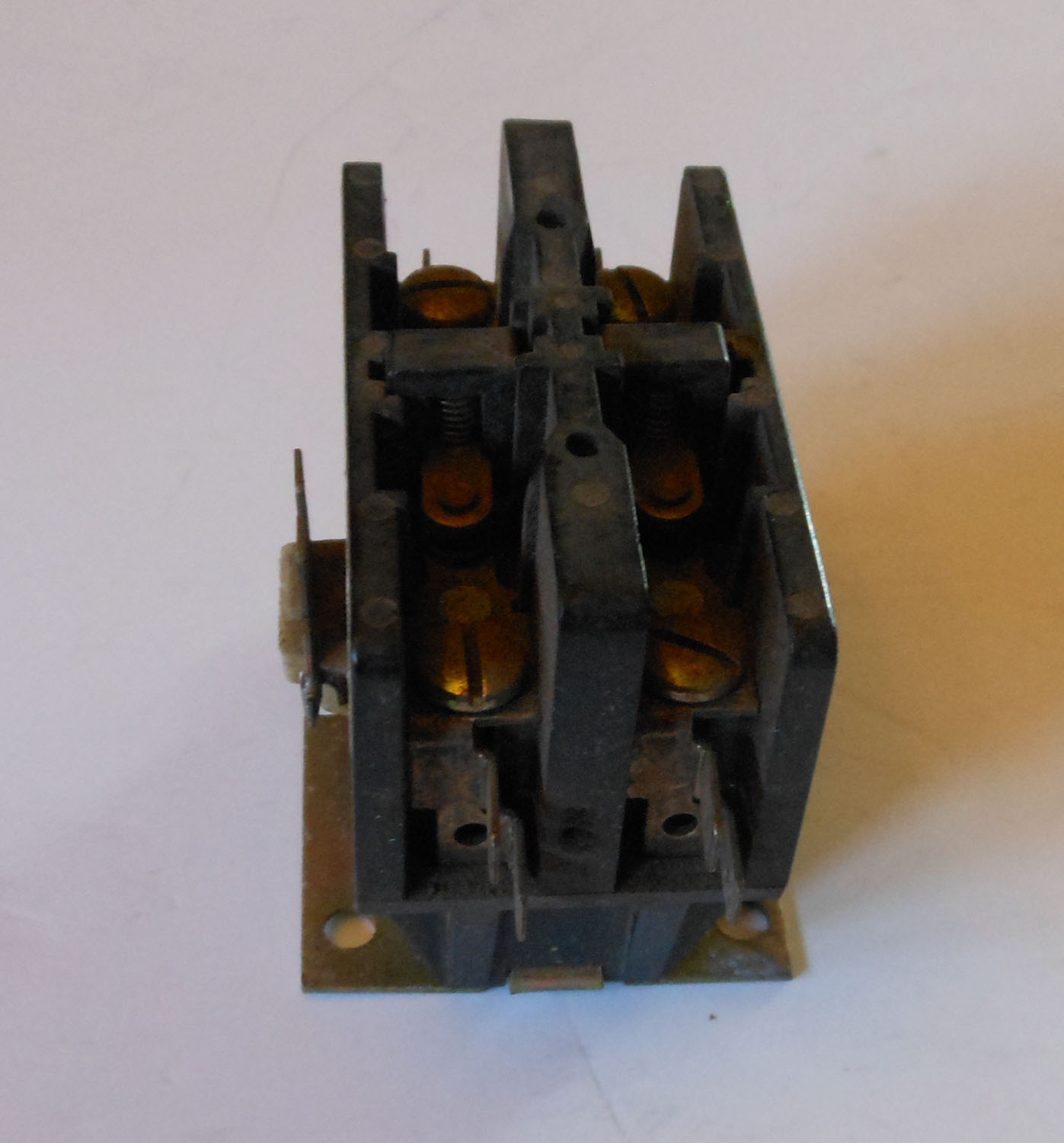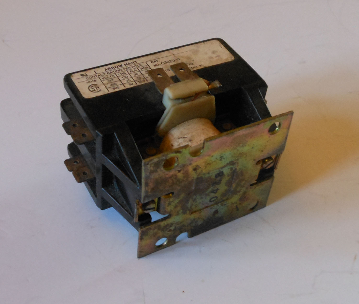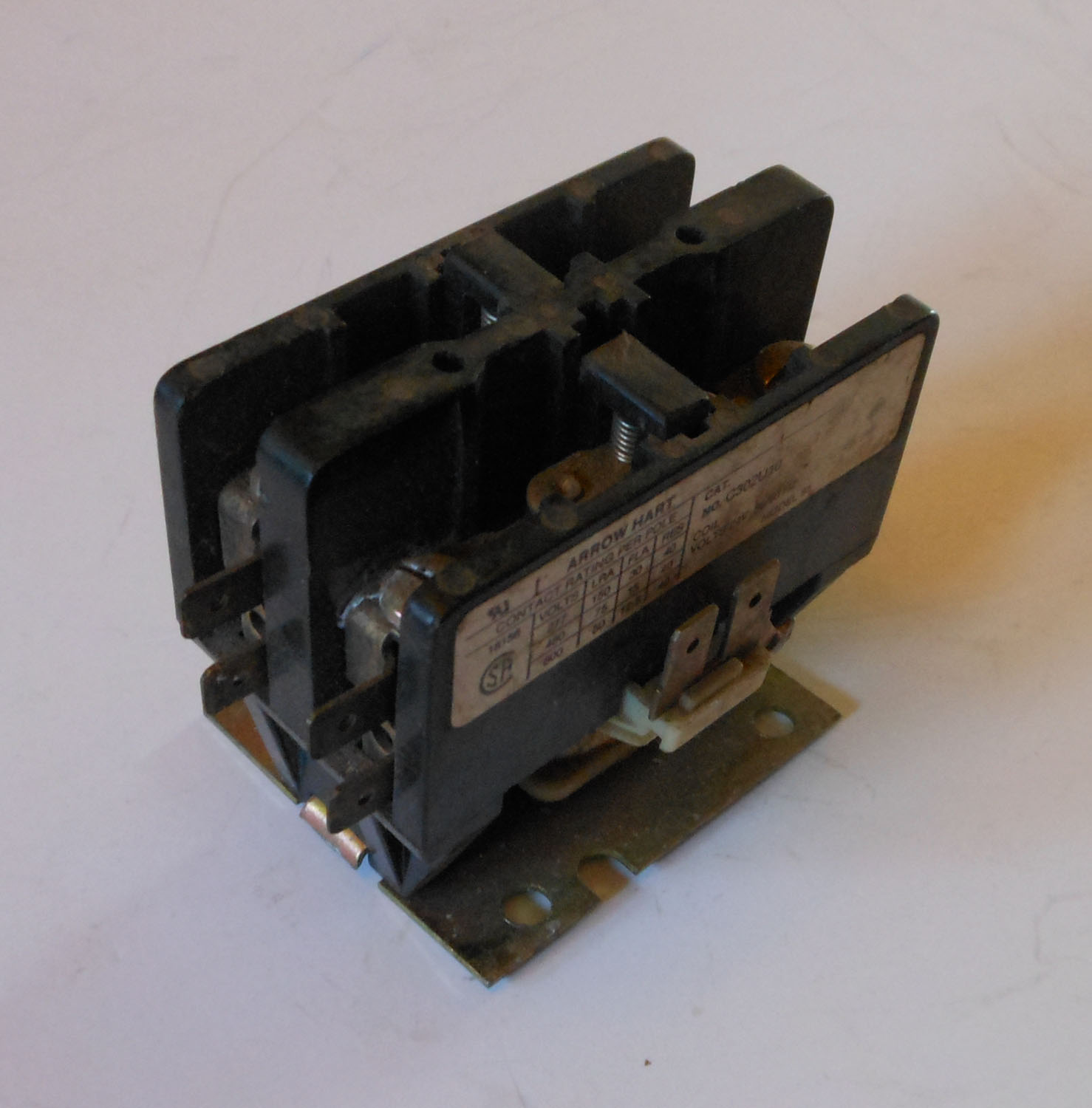 USED This contactor model 85 measures 2 5/8″ long by 1 7/16″ wide and is 2 3/8″ tall. The category number is C302U10. It is made of plastic and metal. The Arrow Hart manufacturer number is 18156. See the chart below for the specifications.