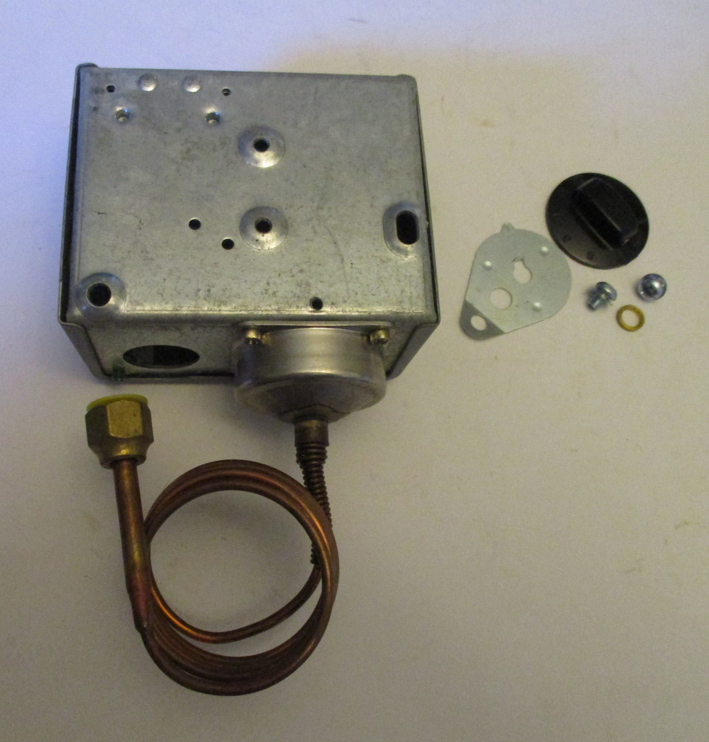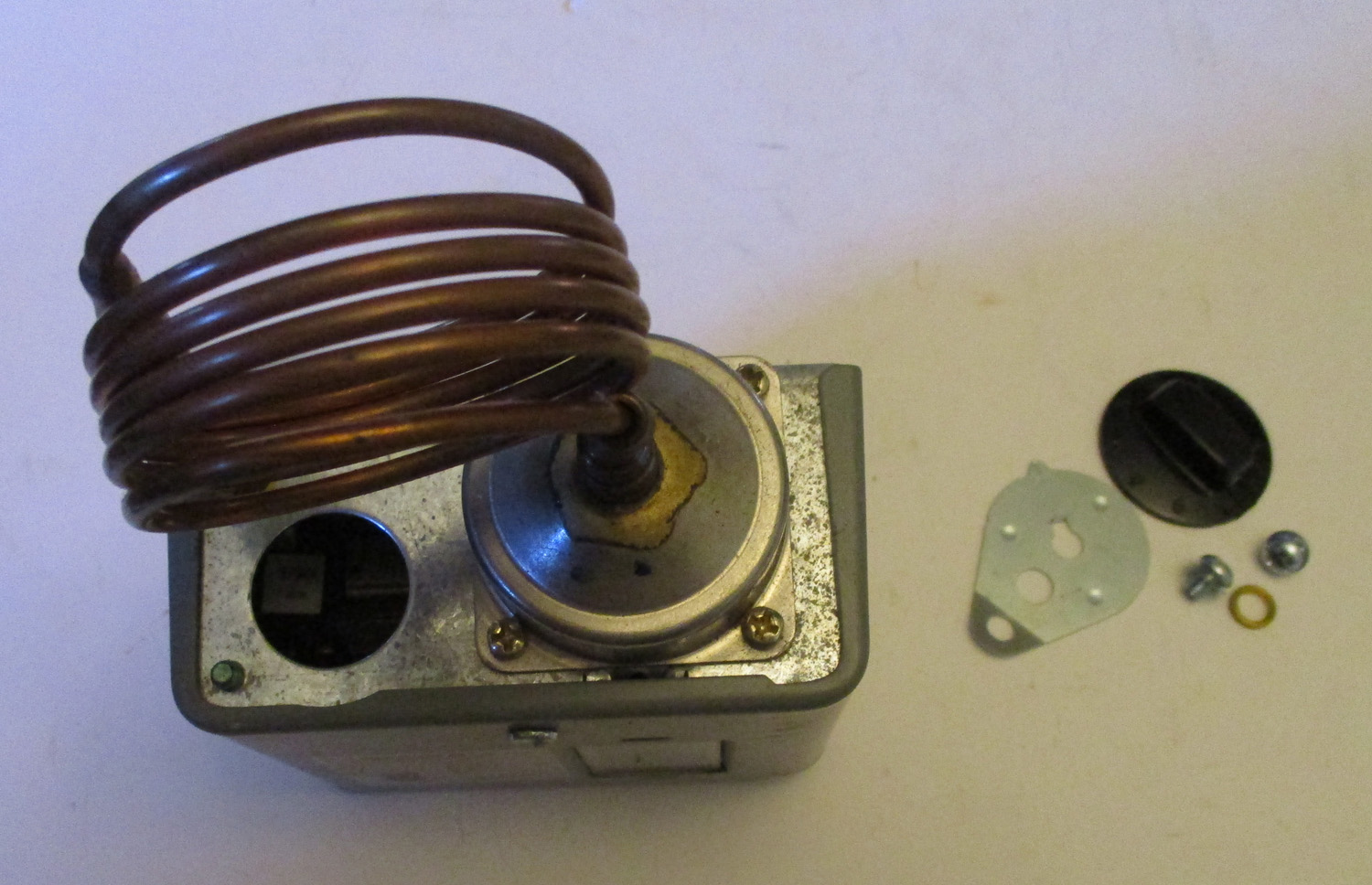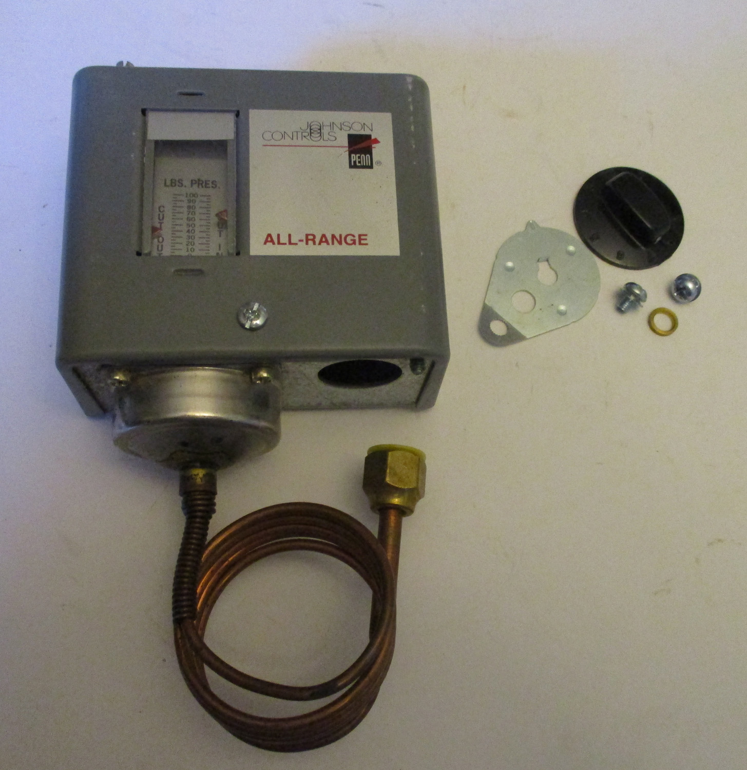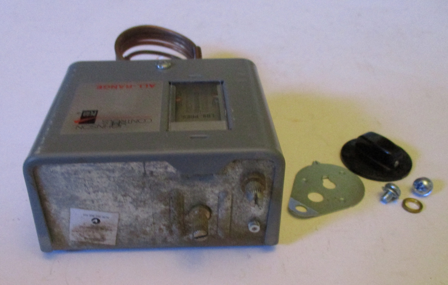NEW This Johnson Controls metal pressure control for P70, P72, and P120 low-pressure applications. This unit measures 3 1/4″ high, 4″ long, and 2 1/16″ wide. There are 3 1/2 feet of copper wire with a brass coupling on the end which has a 3/4″ outer diameter and a 3/8″ threaded inner diameter. The original Johnson Controls part number is 03-P70