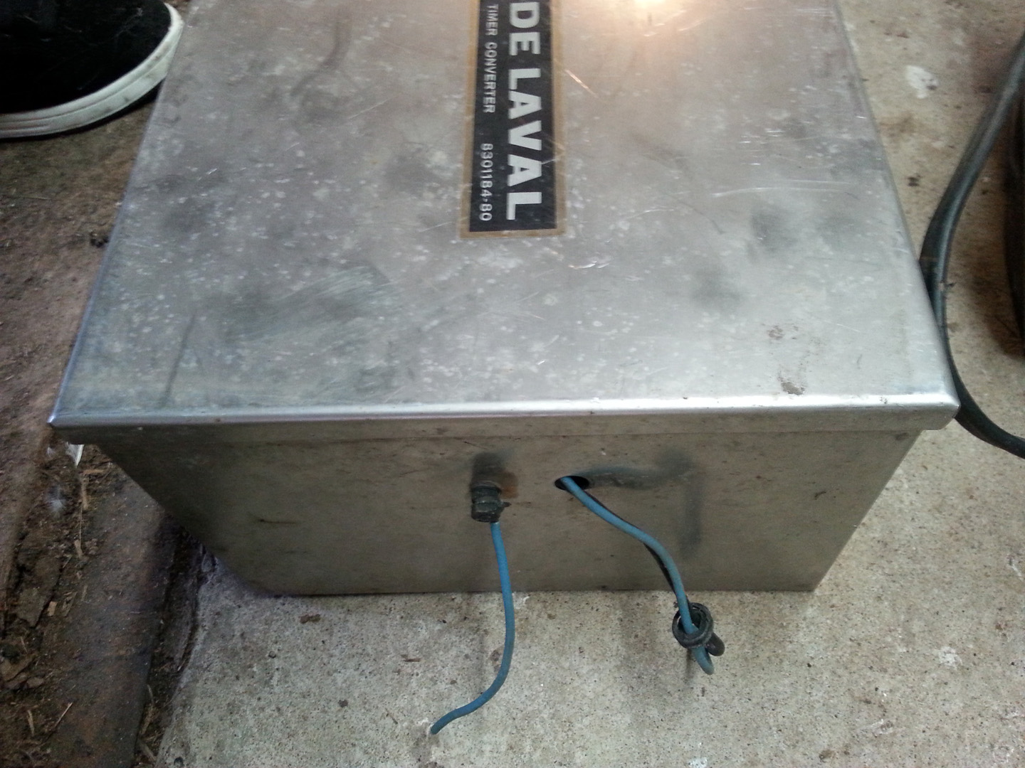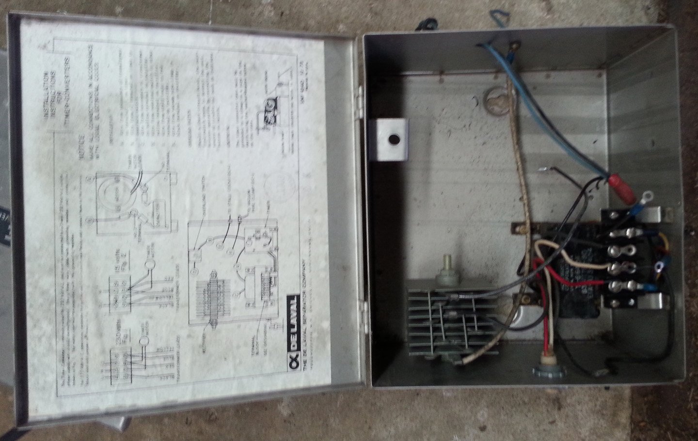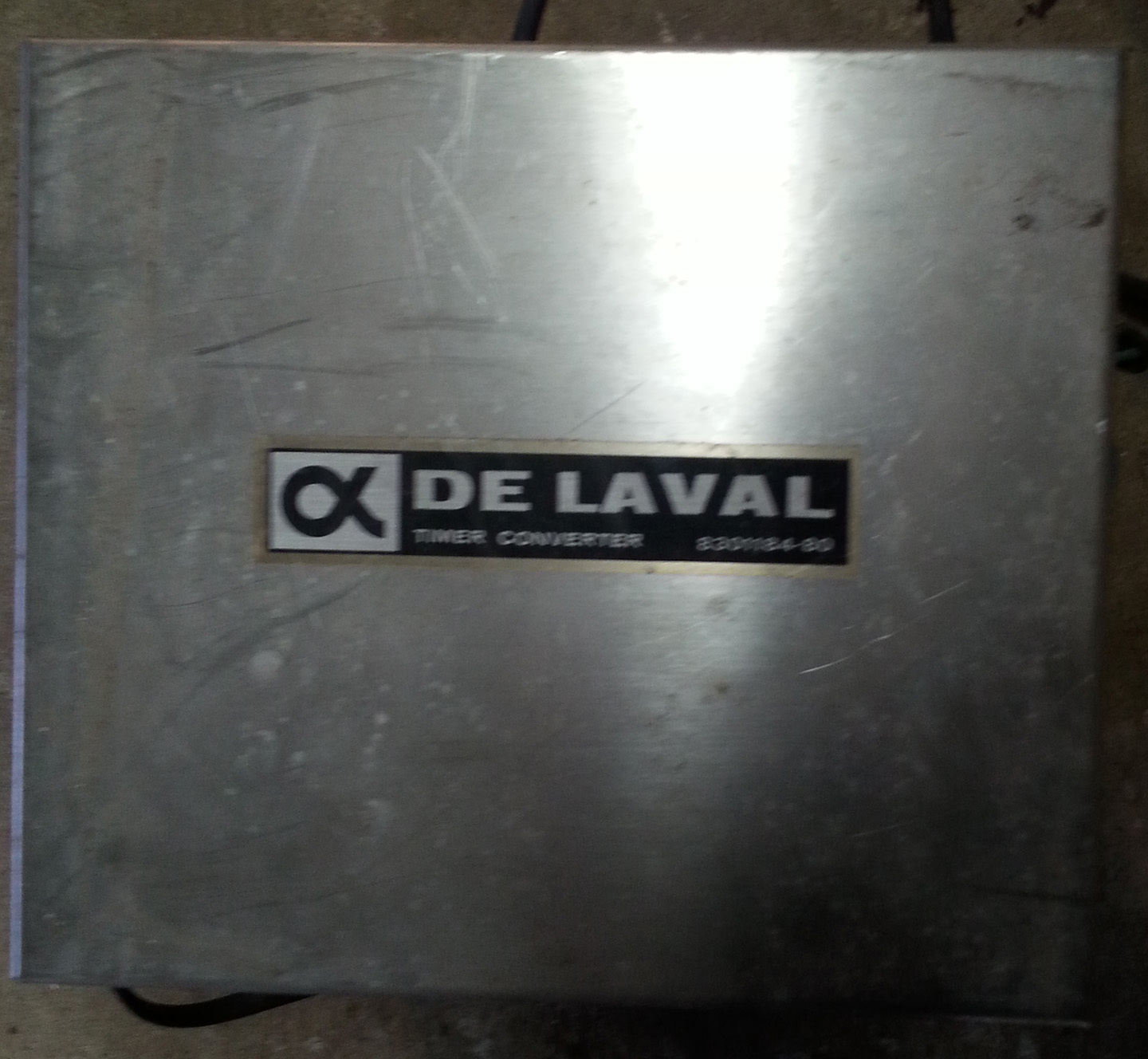 USED This metal, timer converter measures 10″ by 11 1/4″ by 6 1/4″. The tag lists the input as 230/115 volts AC. The DeLaval part number is 8301184-80. This is listed as a for-parts item; it has not been tested.