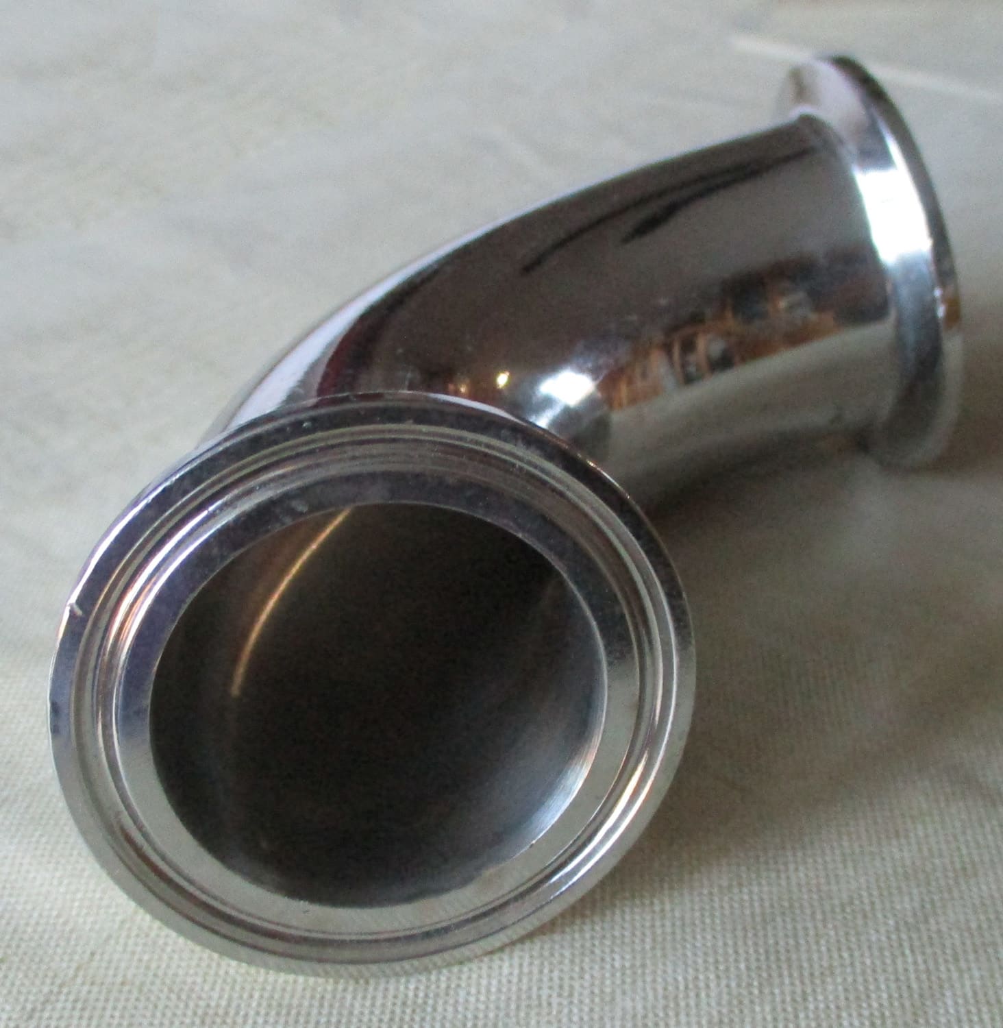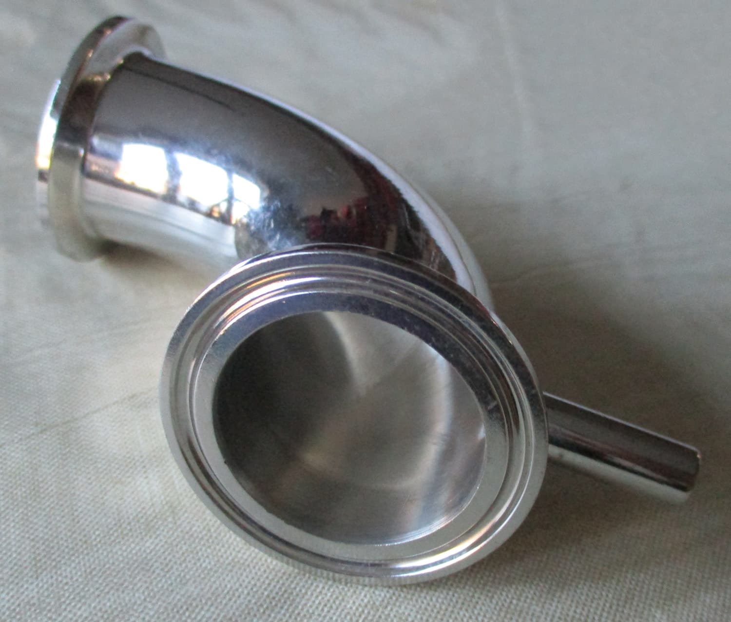 NEW This Schlueter 90° stainless steel drain elbow is for a 1 1/2″ pipe. It is 5 3/16″ long, 3″ high, and 2″ wide, overall. The outside diameter is 1 1/2″ and the inside diameter is 1 3/8″. The glass ferrules have a 2″ outside diameter. The drain tube is 1/2″ from the end of the pipe and is 1 1/8″ long with a 7/16″ outside diameter and a 1/4″ inside diameter.