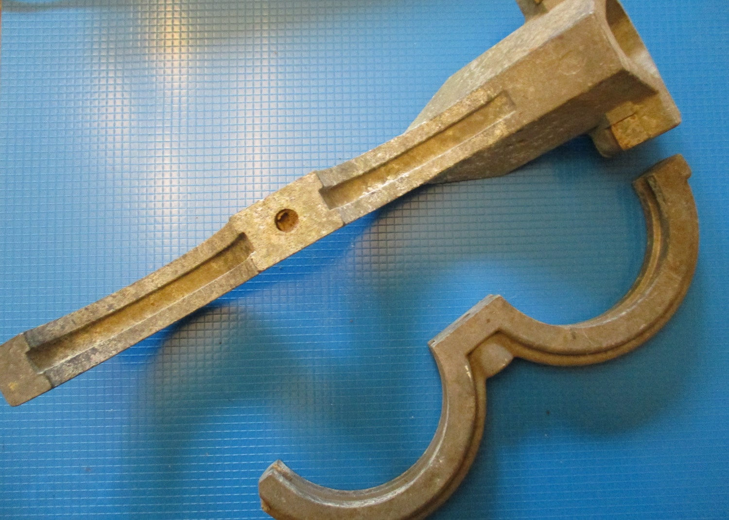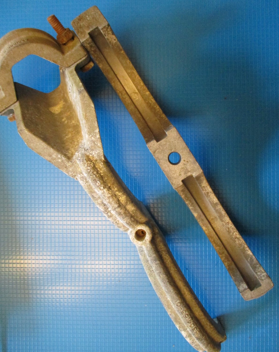 USED This DeLaval hanger measures 12 3/4” long by 5 1/16 wide by 1” thick. The collar measures 3 3/8” inside diameter and 4 15/16” outside diameter. The side clamp measures 2” inside diameter by 1 13/16” wide and 1 7/16” thick. The channel measures 3/8” wide by 1/8” deep. This is a DeLaval part and the part number is unknown. This part is made from a white metal.