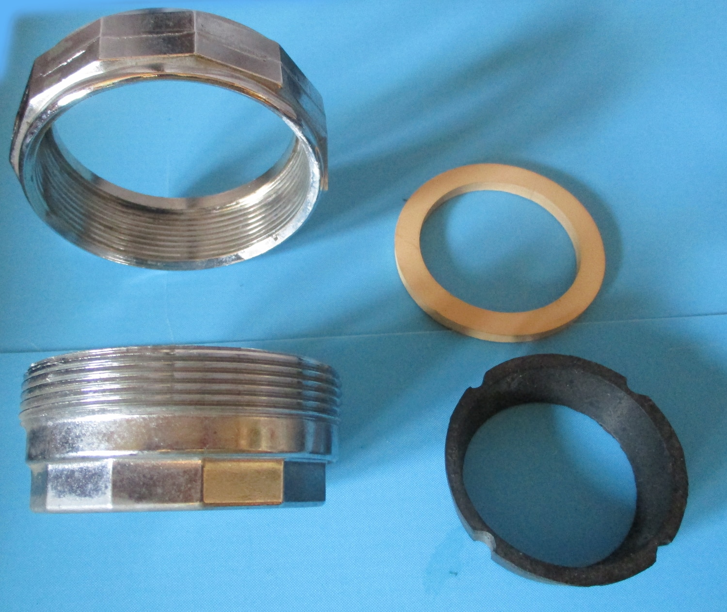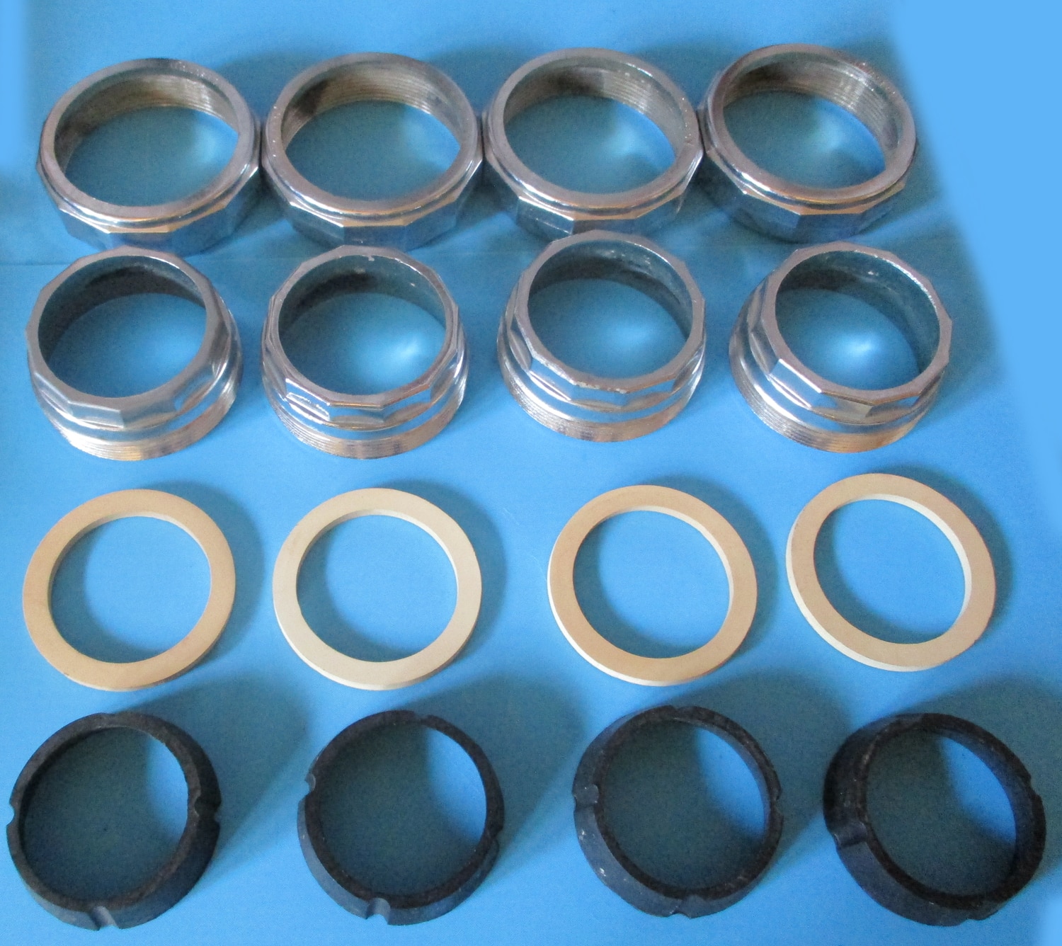 NEW These glass nut assemblies are made of metal and rubber. The outside diameter is 3 1/4″, and inside diameter is 2 13/16″ on the female end. On the male end the outside diameter is 2 13/16″ and inside diameter is 2 5/8″. The gasket has an inside diameter of 2″ and an outside diameter of 2 5/8″. The friction ring is tapered and has a 1 7/8″ inside diameter on the small end and 2 1/8″ on the large end. Put together the glass nut is 1 1/2″ tall. This is a package of four (4) glass nuts.