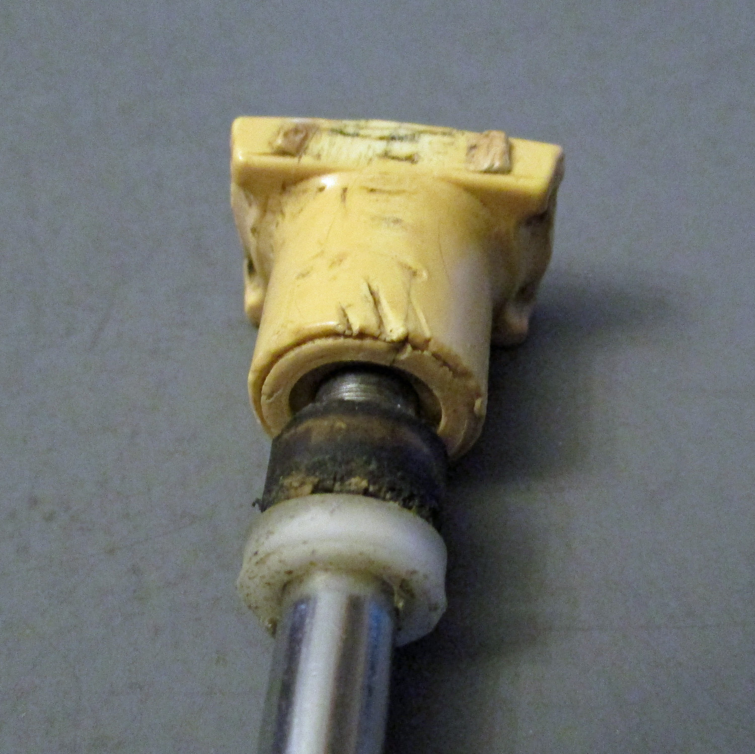 USED This stainless steel, rubber, and plastic handle goes on a vacuum shutoff gate valve. The handle measures 5 1/8″ long overall, with the rod having an outer diameter of 1/4″. The plastic knob measures 7/8″ long by 5/8″ wide. The Valterra Products Inc part number is unknown.