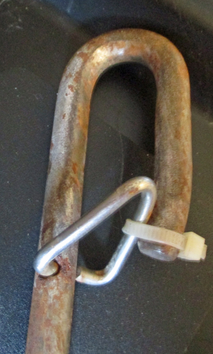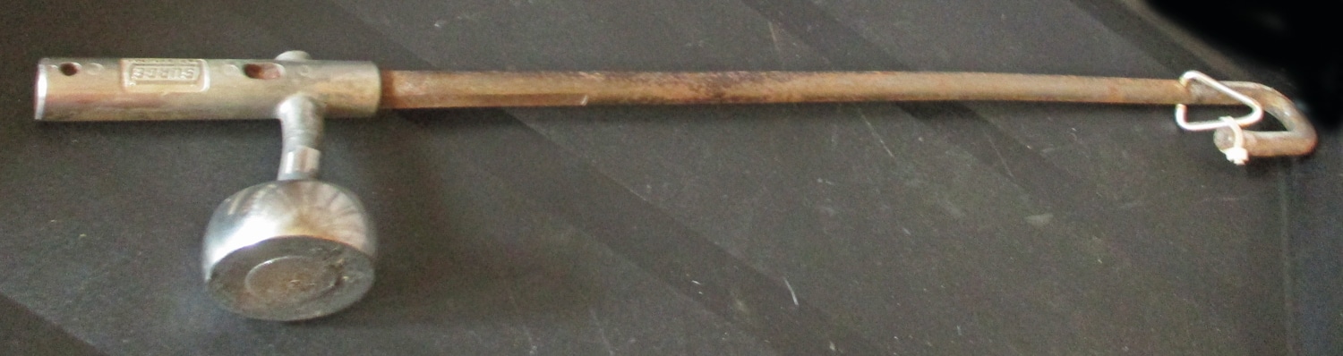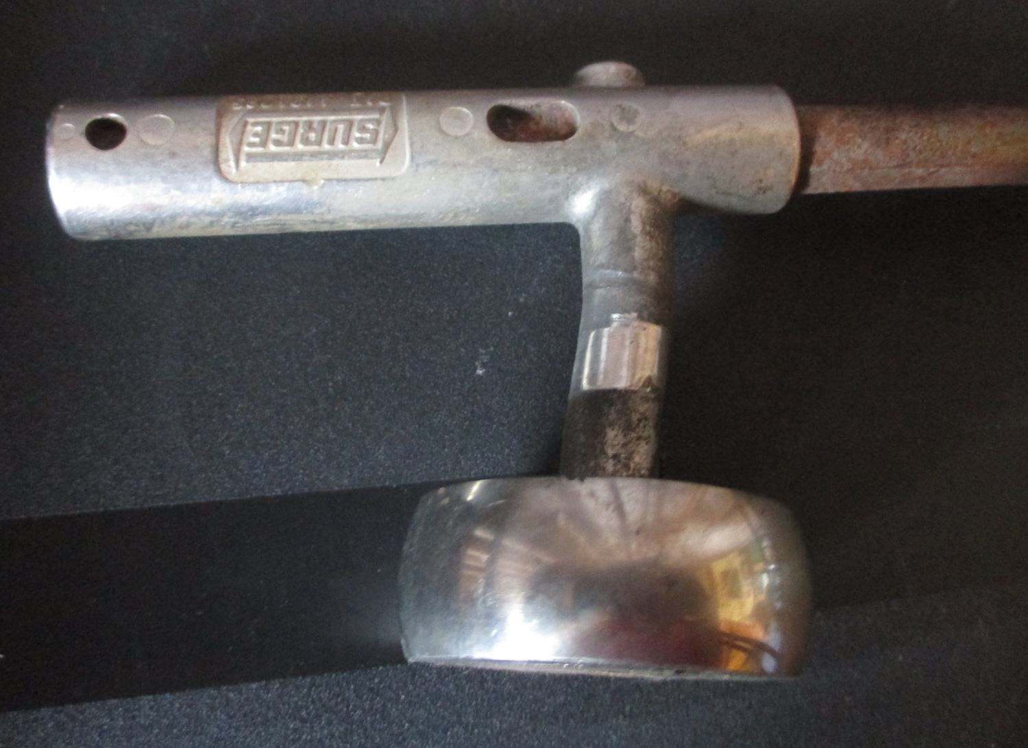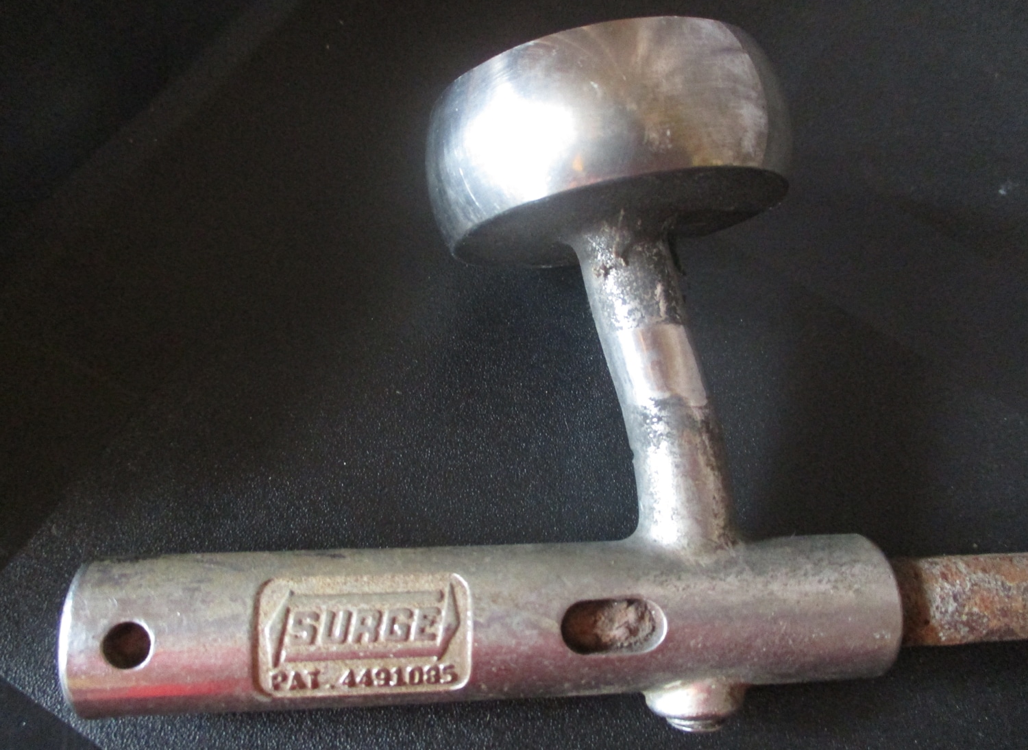 USED This hose support arm is made of metal. The triangle shaped hook and the pivot part on the end of the rod is made of stainless steel. The arm is 25″ long, 3 1/2″ wide and the rod has an outside diameter of 1/2″. The Surge part number is unknown.