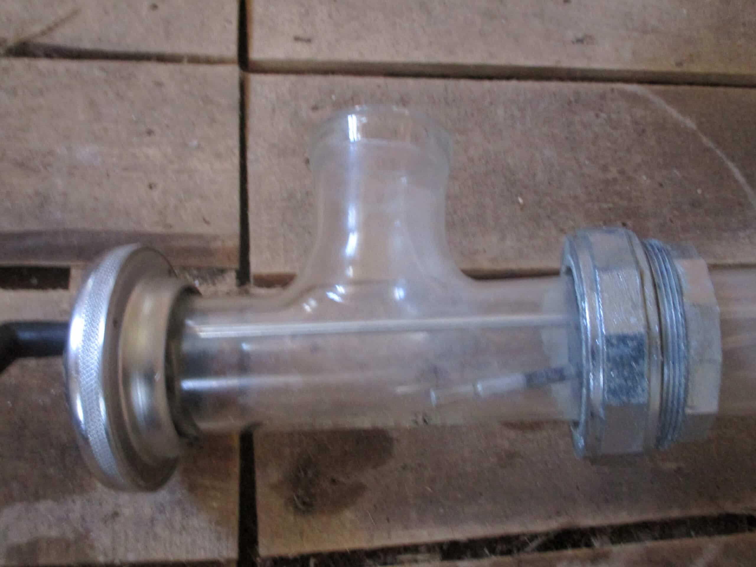 The side nipple with the glass tee attached is 3 1/2″ long, with a 2 1/4″ outside diameter. The glass tee is 8″ long and has a 2 1/4″ outside diameter with an inside diameter of 2″. The outside diameter of the collar is 4″, and the glass coupling with nut has an outside diameter of 3 3/4″.