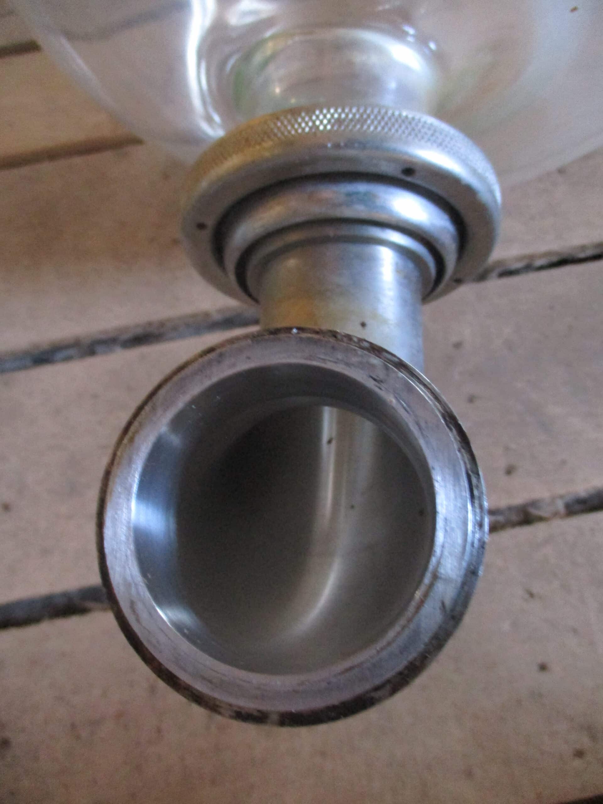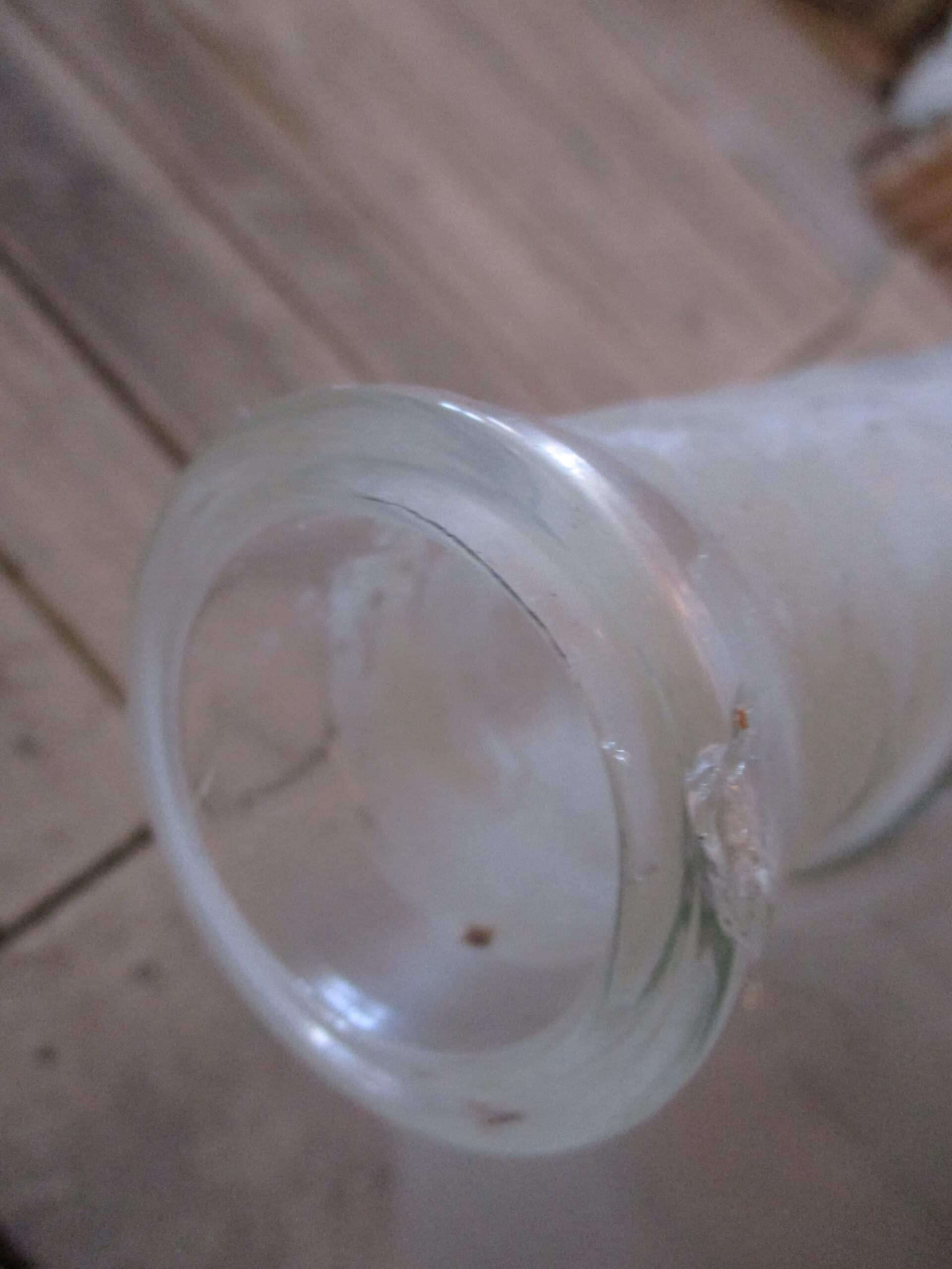 Looking at the complete picture of the receiver jar, the nipple on the bottom right side is chipped. This nipple has an outside diameter of 1 7/8″, and an inside diameter of 1 1/2″. The length of this nipple is 2 1/4″.