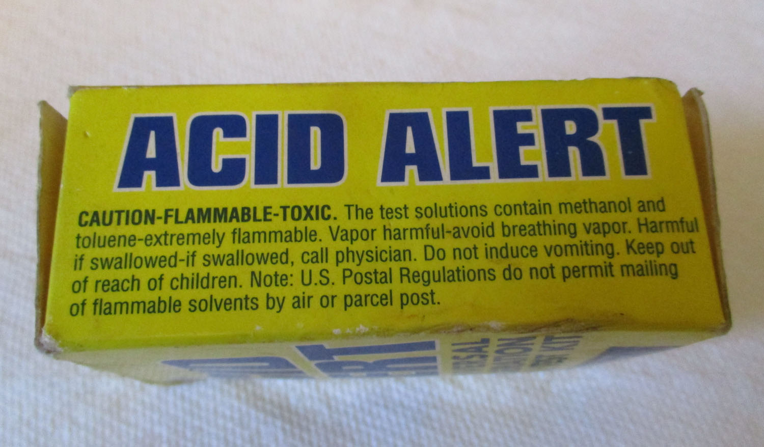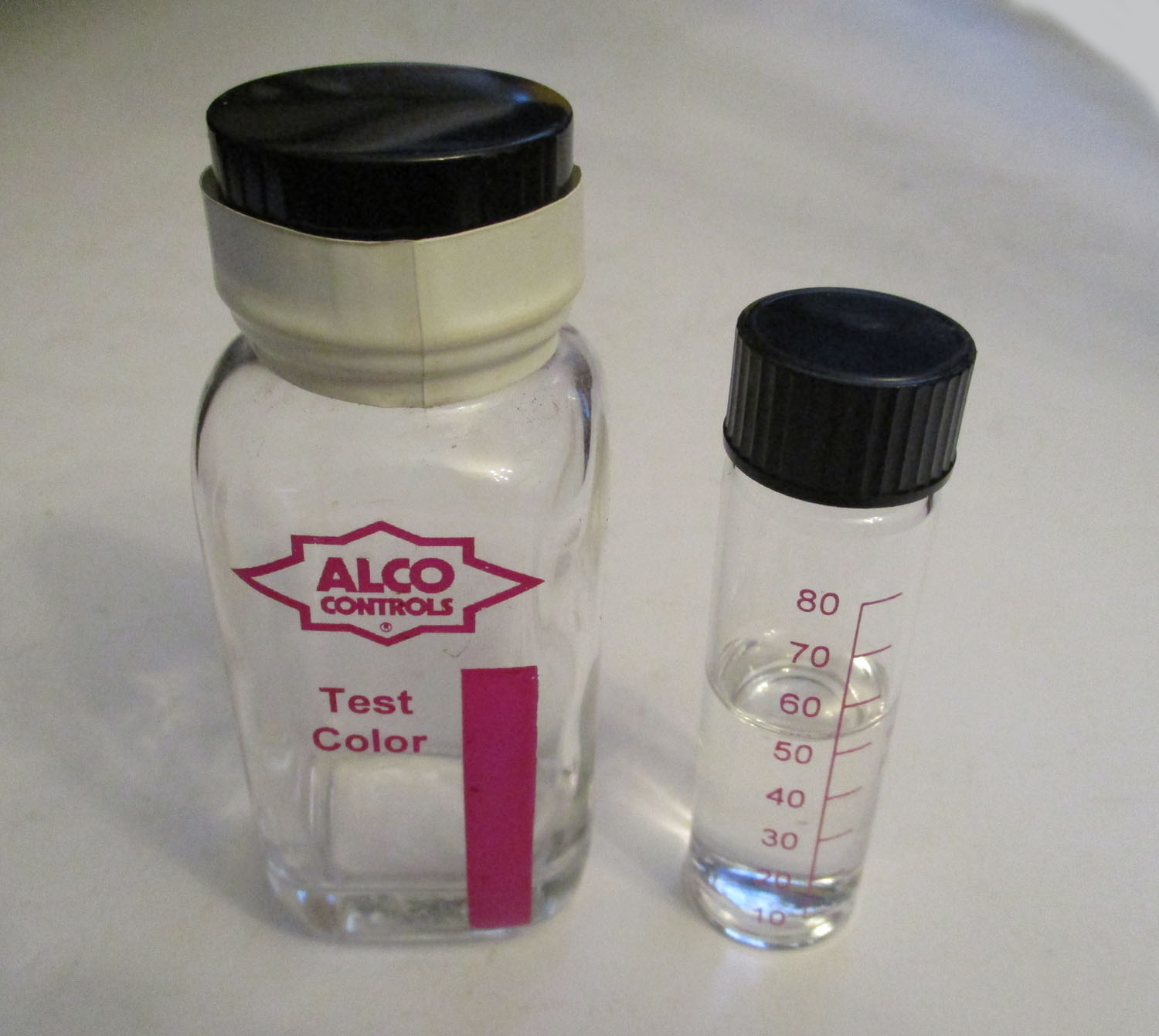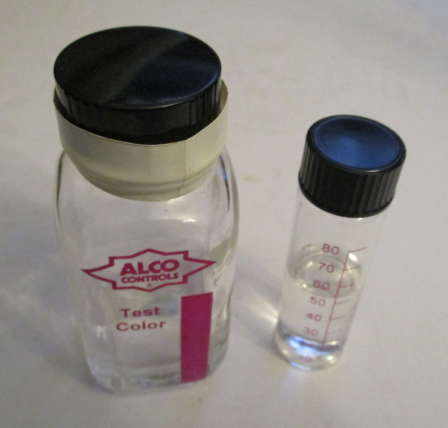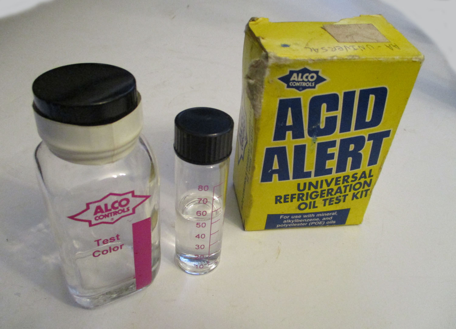 NEW  This universal refrigeration oil test kit consists of two glass bottles, testing liquid and directions.  The box measures 3 9/16″ tall by 2 3/8″ wide by 1 1/2″ deep.  The small acid bottle is 2 1/2″ tall.  The large test color bottle is 3 1/2″ tall.