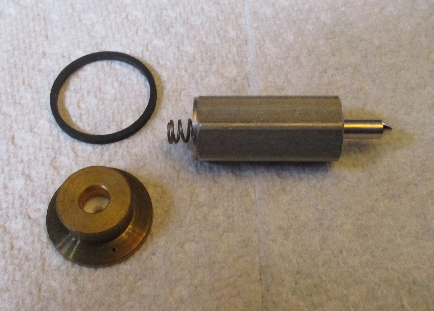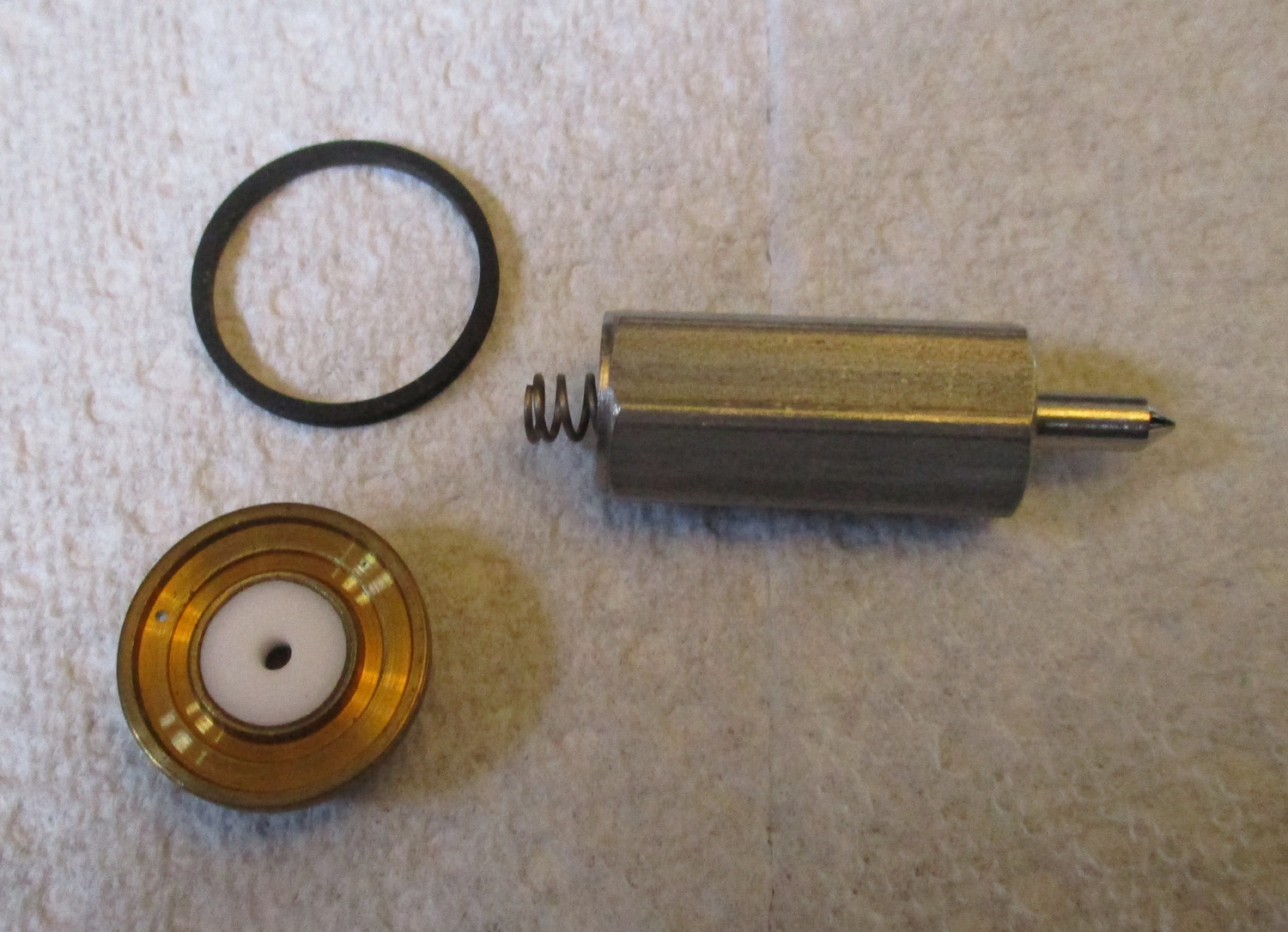 NEW This Sporlan metal, plastic, and rubber valve repair kit include three parts. The stem/plunger is 1 5/8″ long, total, including the 1 1/8″ long cylinder, the 1/8″ kick-off spring, and the 3/8″ point which has 1/8″ outside diameter. The seat disc is 5/16″ high with a 3/4″ outside diameter for the larger end and a 1/2″ outside diameter for the smaller end. The inside diameter is 3/16″ on one end and 1/16″ on the other. The rubber washer has a 7/8″ outside diameter with a 13/16″ inside diameter, is 1/16″ high and fits onto the seat disc. The original Sporlan part number is 30226, with a KS-B9 printed on the box, also.