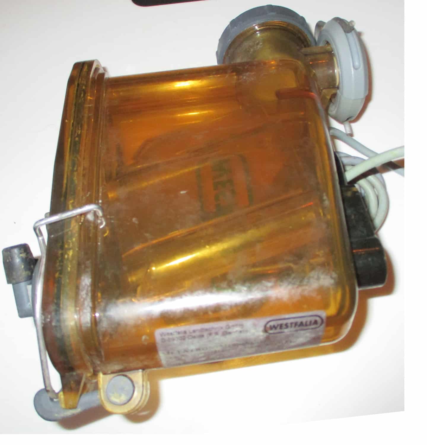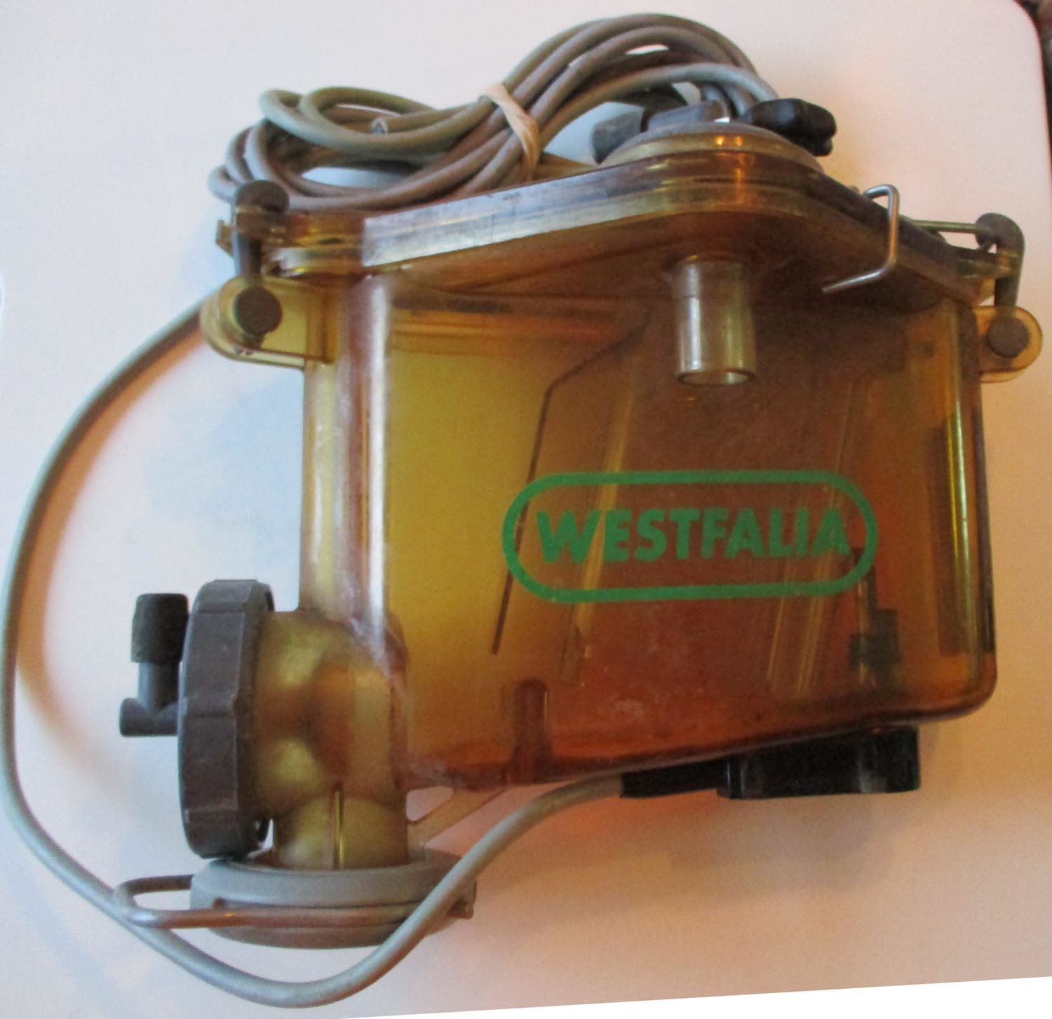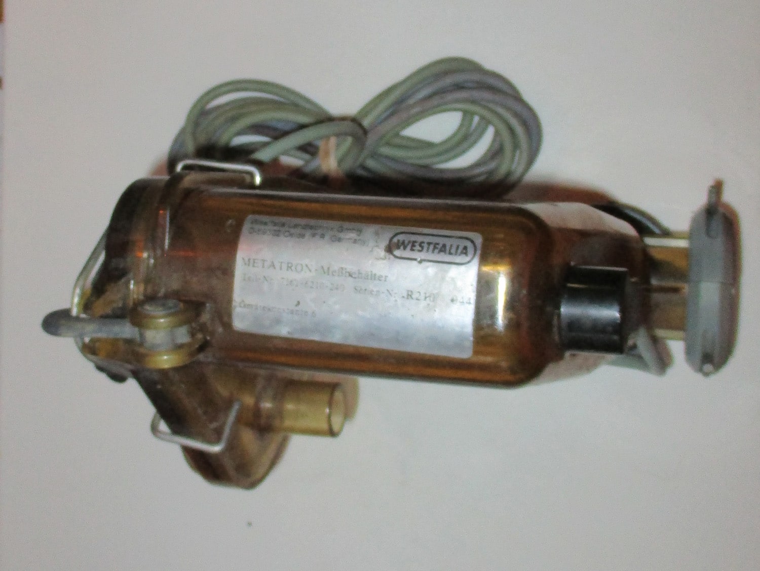 USED This is a plastic, metal, and rubber Westfalia Milk Meter with a Sample Port. The cord is at least two feet long, maybe a little longer. The body of the meter is 9″ high by 10″ long by 5″ wide overall.