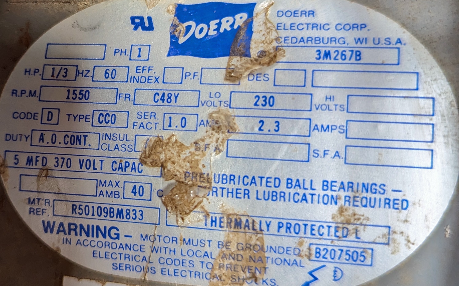 1/3 horsepower 60 hertz 1550 rotations per minute 2.3 amperes 5 micro – farads 370 volts capacity