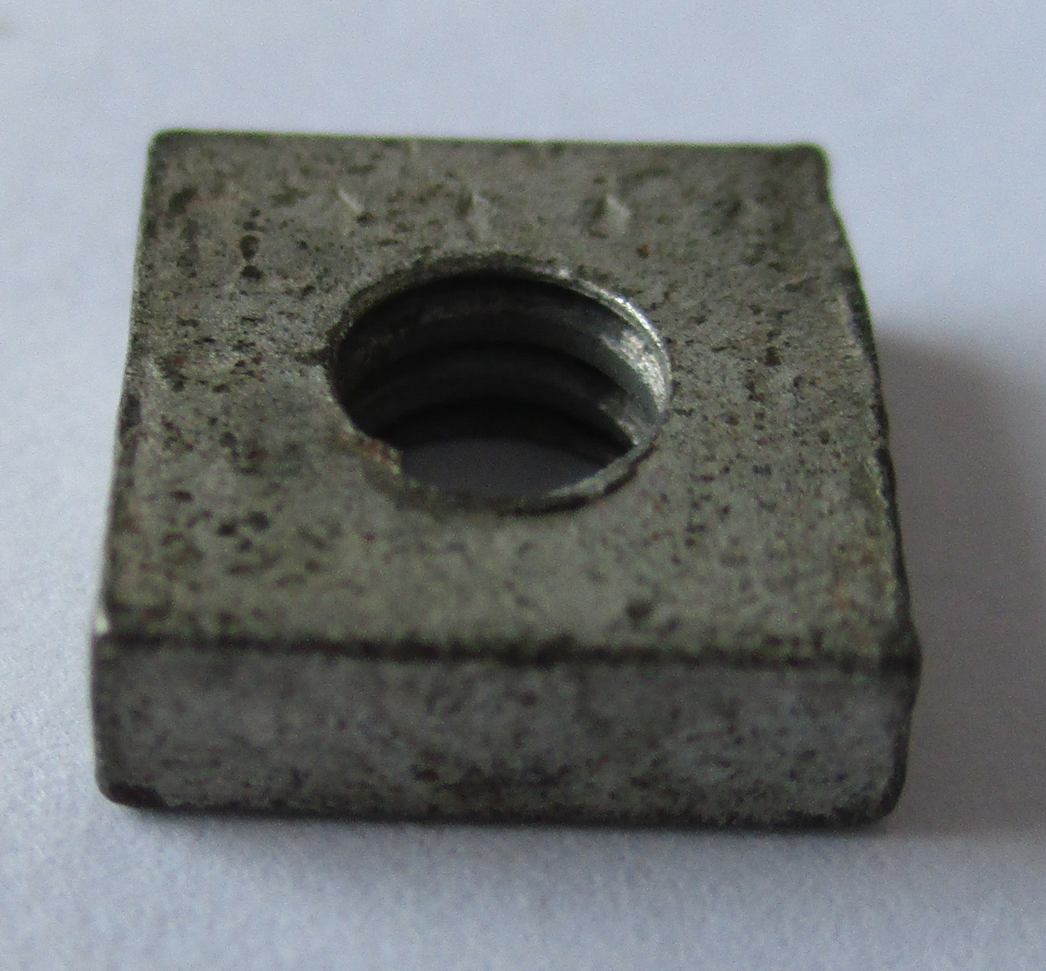 USED This metal nut is 3/8″ square with a 1/8″ inner diameter and is 1/8″ high. The manufacturer and part number are unknown.