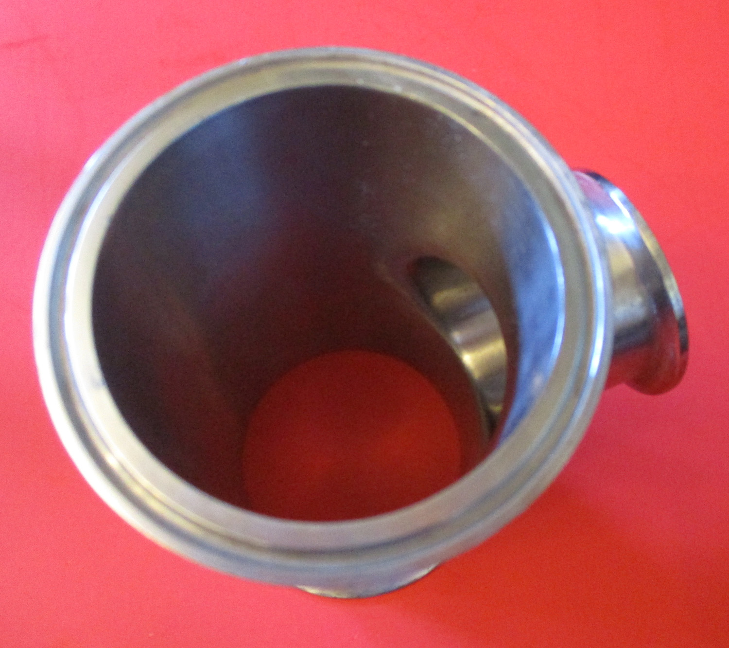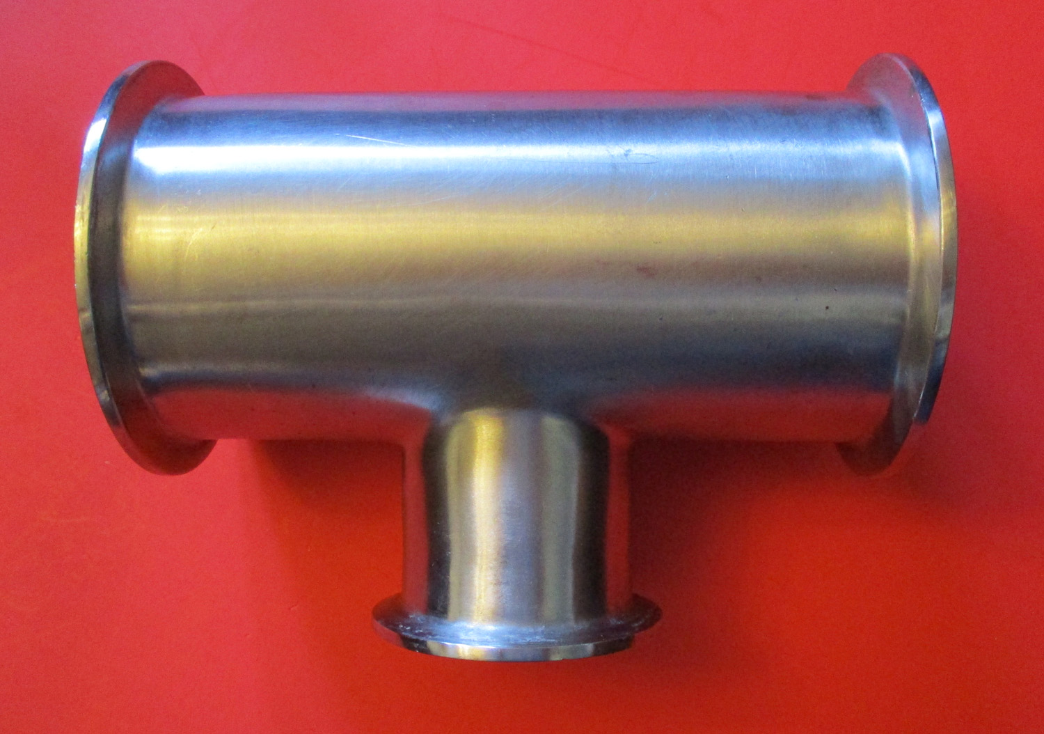 USED This is a stainless steel pipe tee with the stem being 2″ and the tee being 3″ pipe. The tee is 6 1/8″ wide at the widest and it is 4 7/8″ high. The stem is 1 9/16″ long with an outer diameter of 2″ and an inner diameter of 1 7/8″. The ferrule on this stem has an outer diameter of 2 1/2″ and an inner diameter of 2 1/8″ on the groove. The tee part of the pipe has an outer diameter of 3″ with an inner diameter of 2 7/8″. The ferrule has an outer diameter of 3 9/16″ and an inner diameter of 3 1/4″.