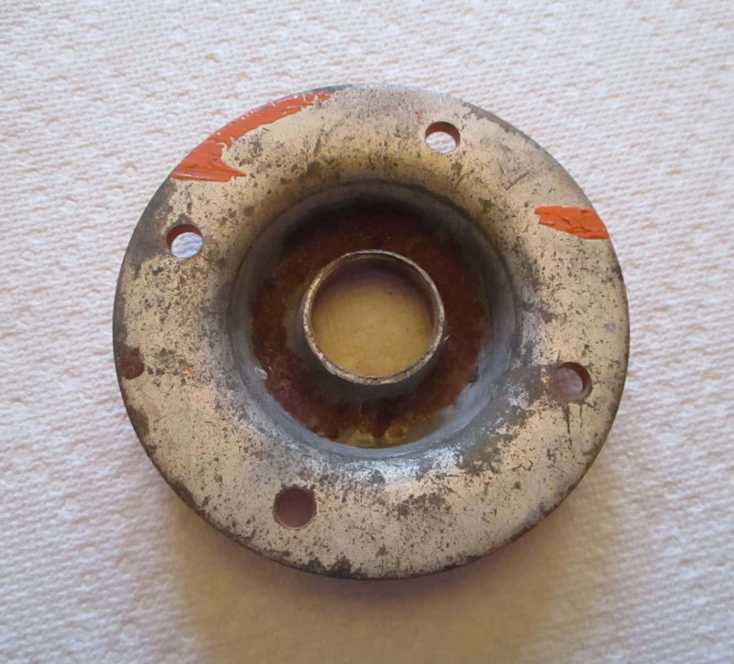 USED This Surge metal plate is threaded and painted orange. The thread size is M24-3.0. The plate is 3 3/16″ in diameter and 3/4″ high. The mounting holes are 1/4″ diameter. The manufacturing number is unknown.