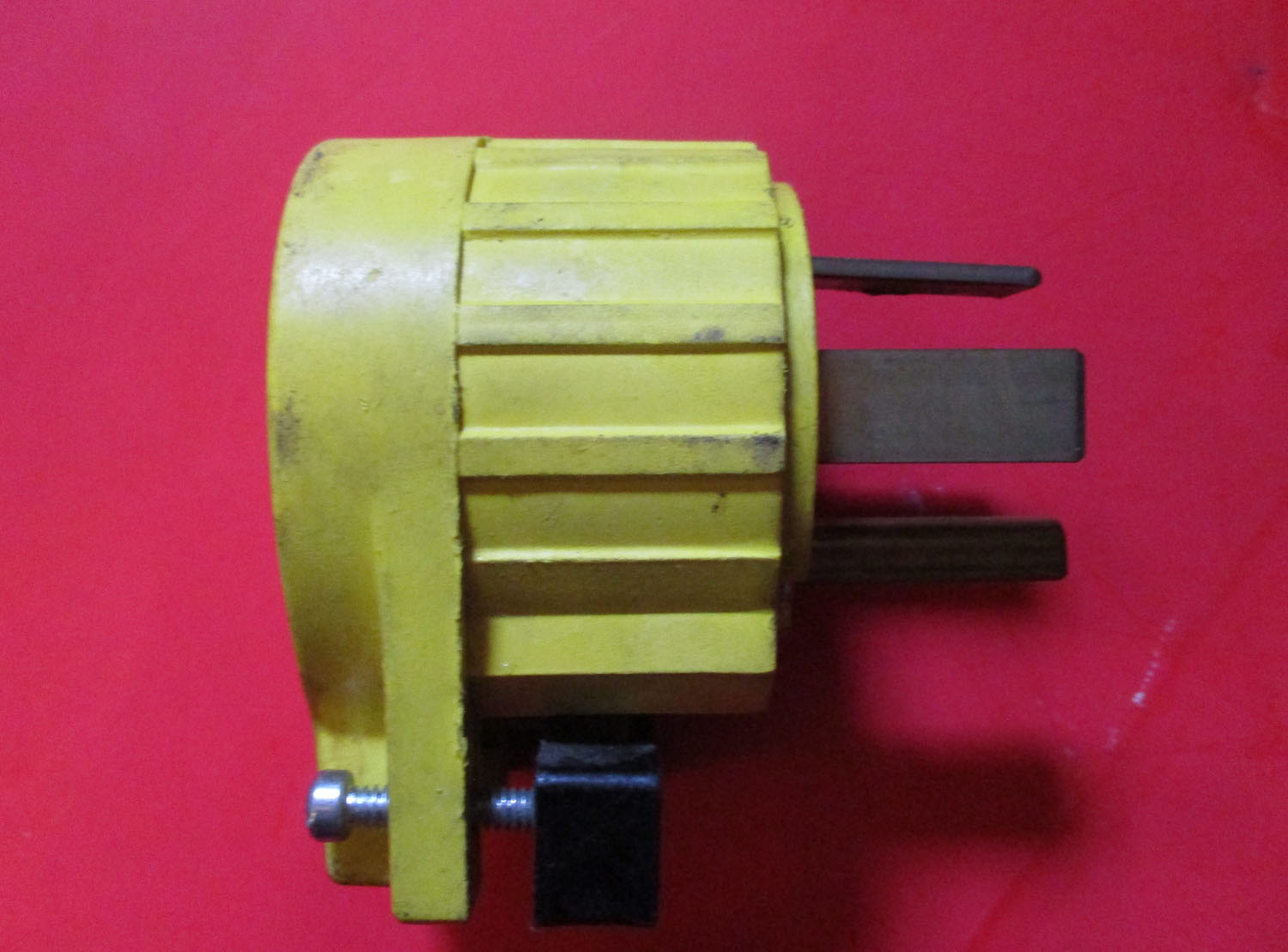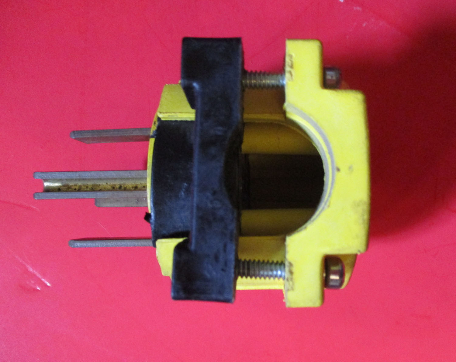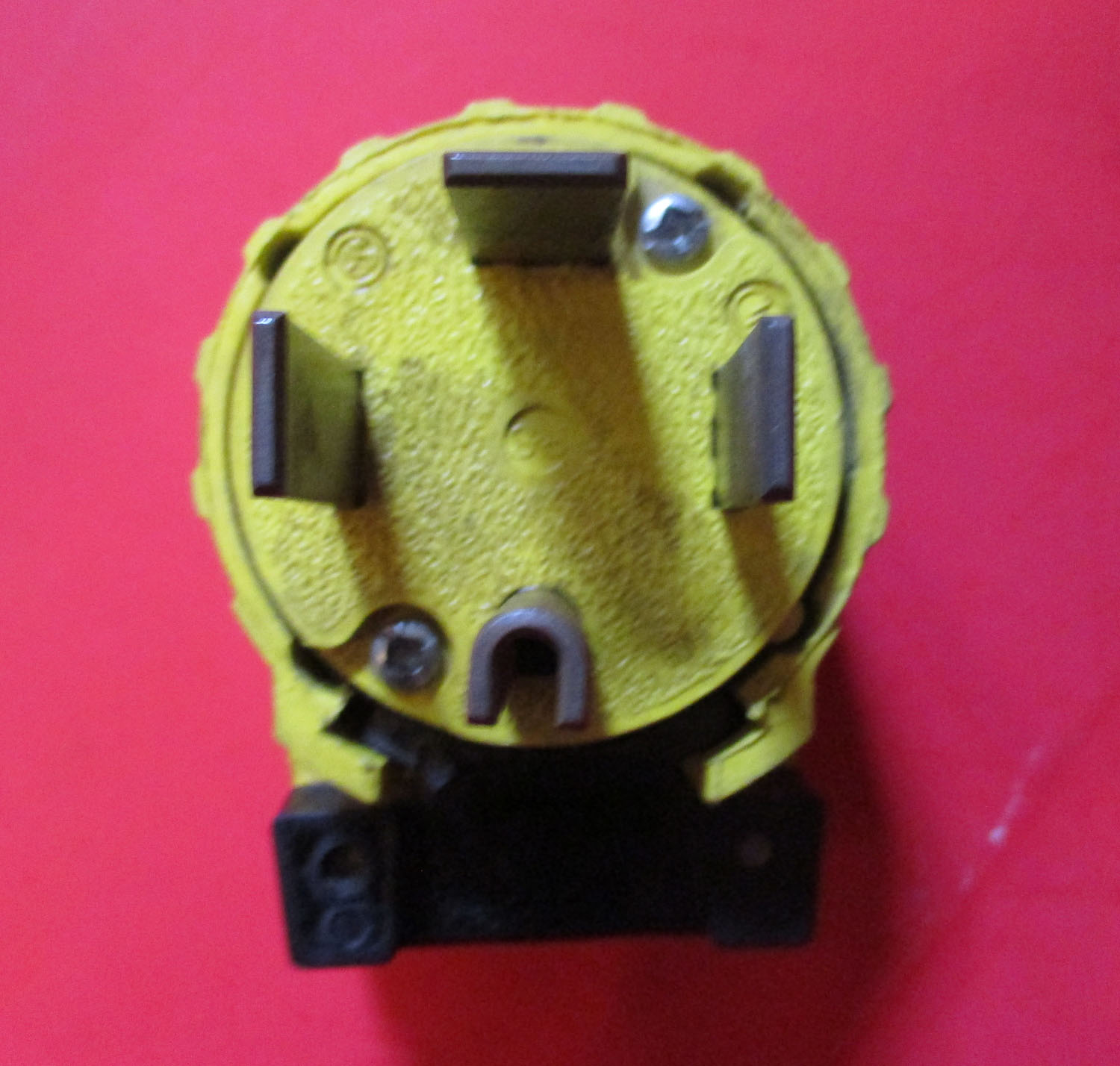 USED This male four-prong angle turn-lock plug measures 3 5/16″ long by 2 1/2″ wide by 2 1/8″ deep without the prongs. With the prongs, it is 3 1/2″ deep overall. This plug is made of metal and plastic. The indicated specifications are 60 amperes and 125/240 volts. The Pass Seymor Legrand manufacturer number is unknown.