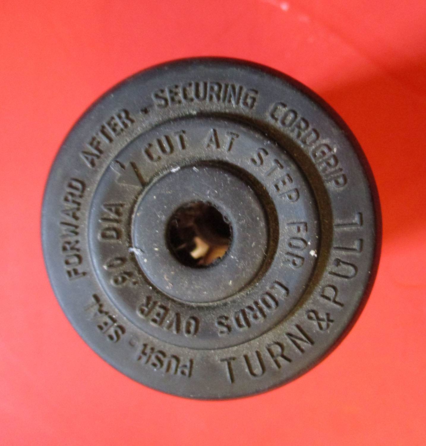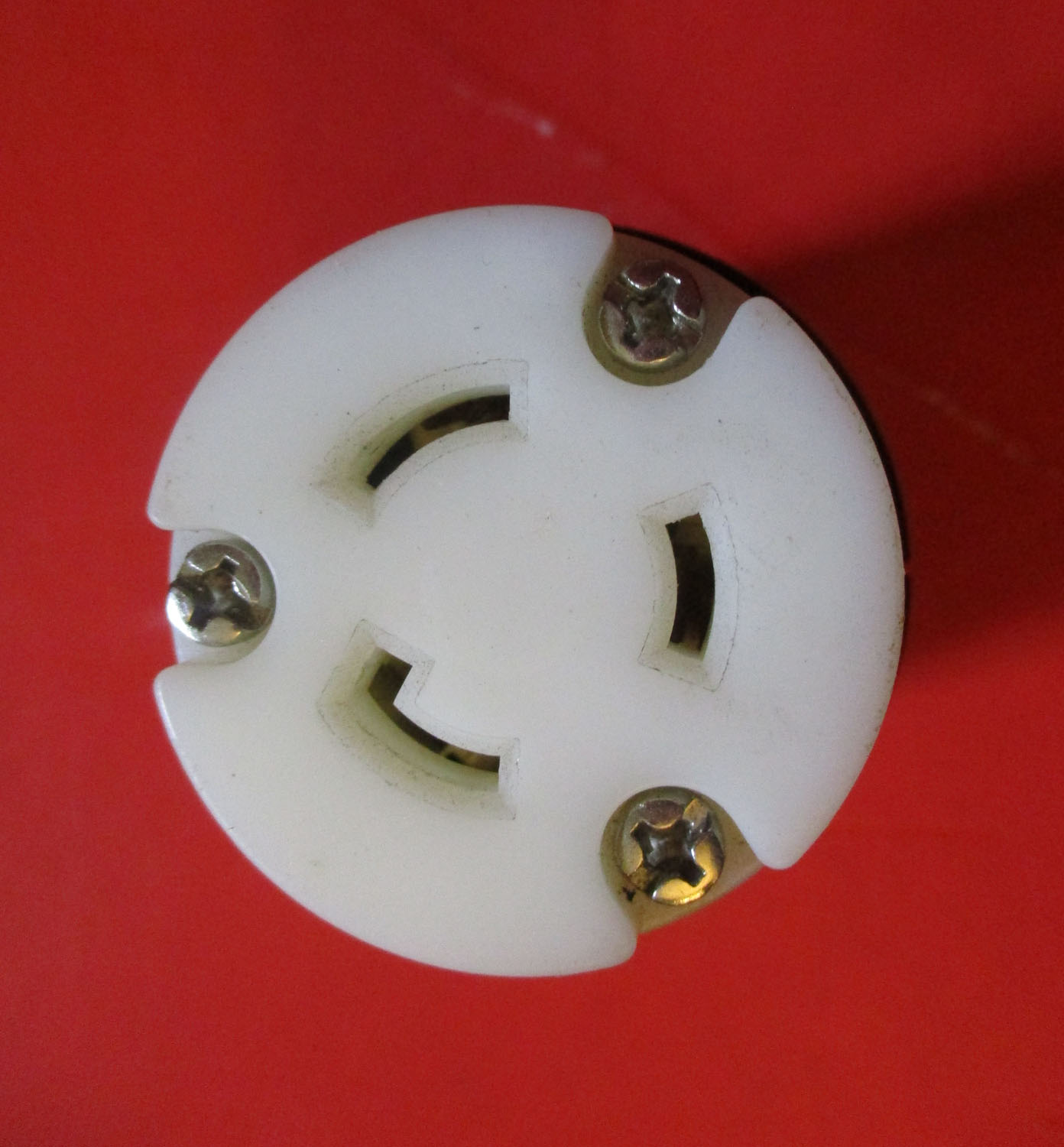 USED This female three receptacle turn-lock plug measures 3 1/4″ long. The grip has an outer diameter of 2 1/16″, and the receptacle has an outer diameter of 1 3/4″. This plug is made of metal and plastic. The indicated specifications are 20 amperes and 250 volts. The Pass Seymor Legrand manufacturer number is L620C.