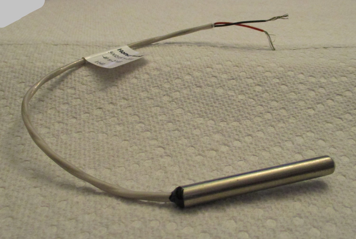 NEW This stainless steel and wire probe measures 11 1/4″ long overall. The probe is 2″ long, with an outer diameter of 1/4″. The temperature range of the probe is -40° to 270° Fahrenheit. The Honeywell part number is 50021579-001.