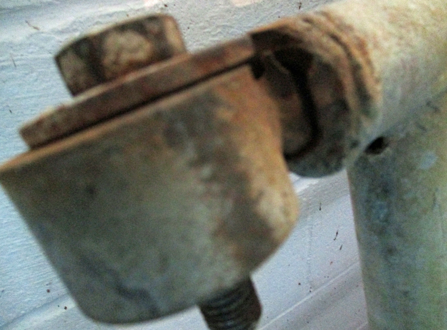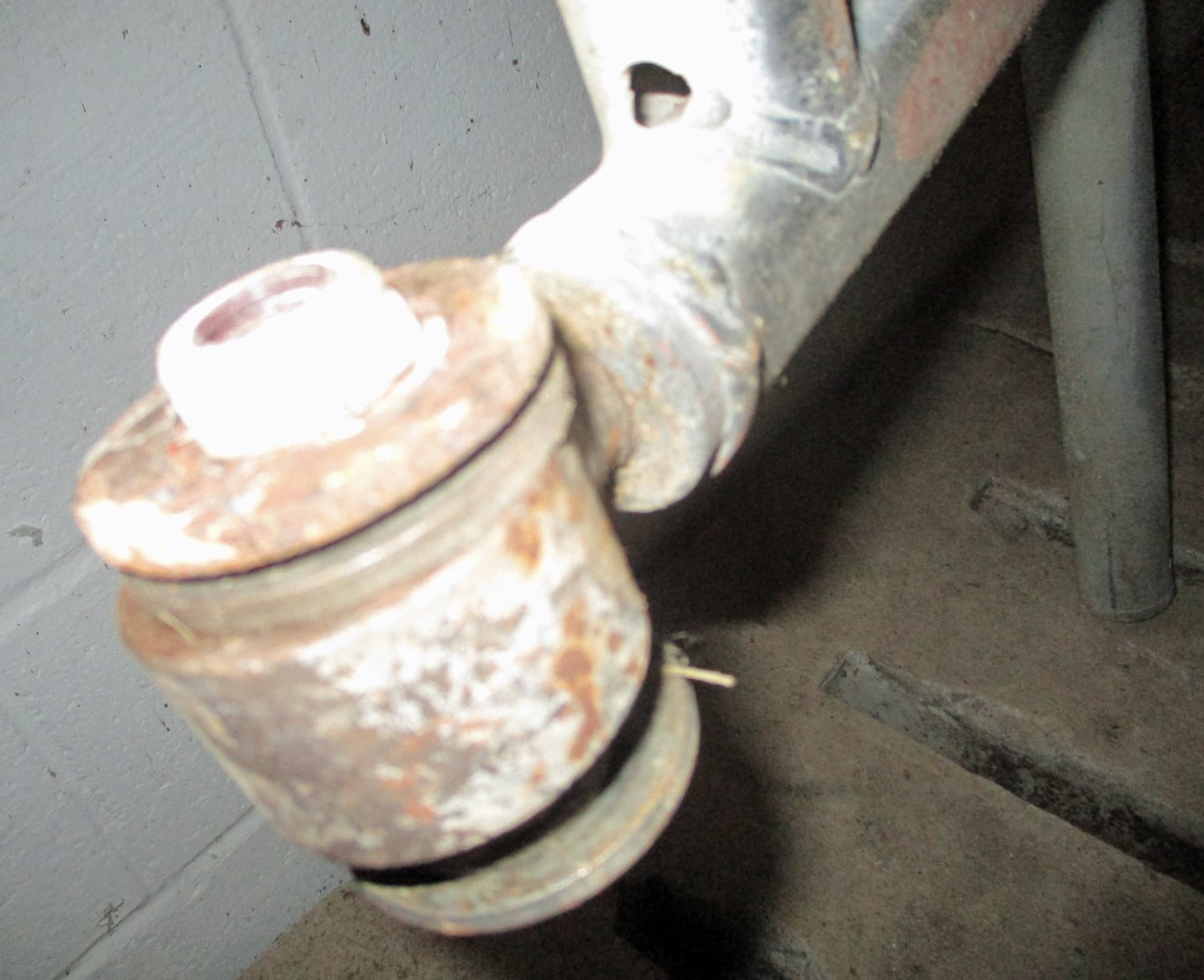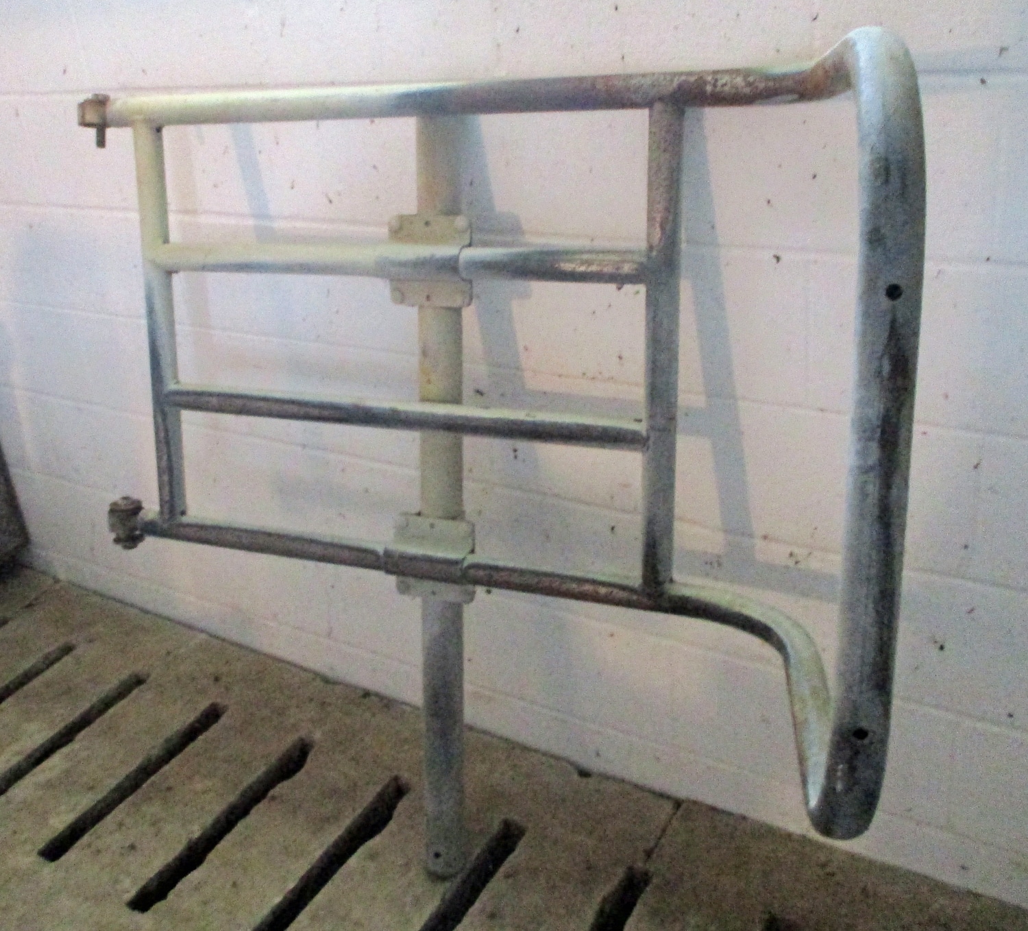 USED This rear gate for the auto flow is made of metal. The overall height is 46″, length 50″ and depth 25″. The outside diameter of the post is 2 3/8″, with a inside diameter of 2 1/8″. The rails have a 1 5/8″ outside diameter. The gate was in an upside down position when the pictures were taken. One (1) of the hinges on one (1) gate is rusted out.