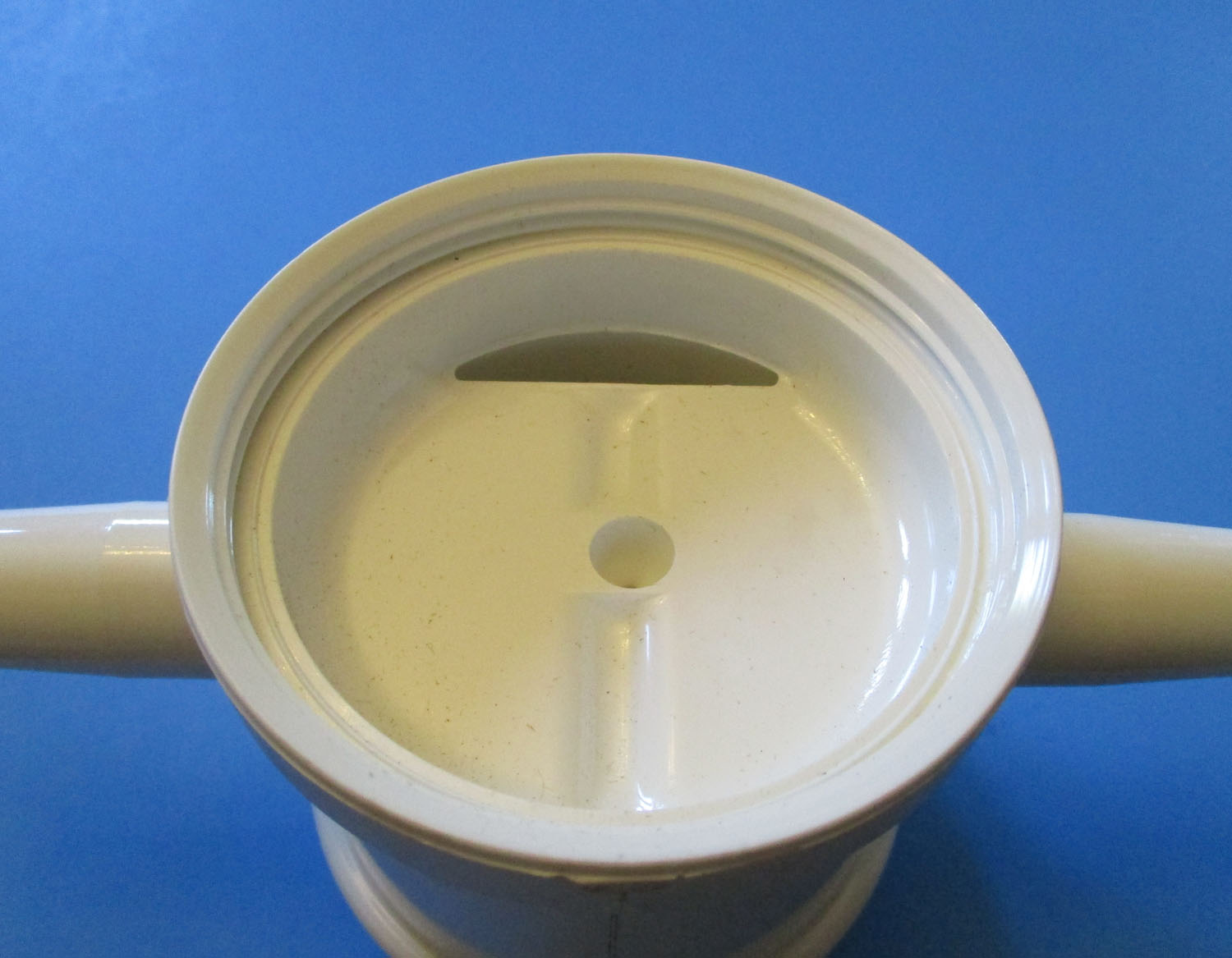 NEW This plastic Milky Weight meter receiver is for a Universal model number 31095. It measures 3 1/16" tall by 7 1/2" wide. The threaded end has an outer diameter of 3" with an inner diameter of 2 5/8". The other end has an outer diameter of 3 1/4" with an inner diameter of 3". The in/out tubes are 2 3/16" long and have an outer diameter of 1/2" with an inner diameter of 7/16". The Schlueter part number is 46410.