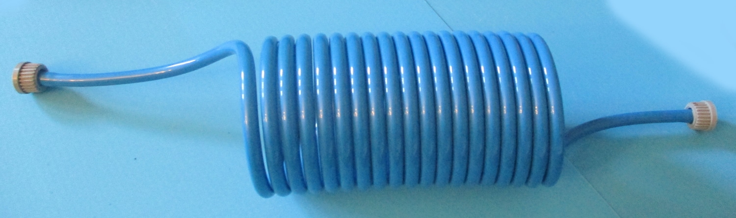 NEW This retractable hose is made of plastic. It is roughly 6′ long, has an inside diameter of 3/16″ and an outside diameter of 1/4″. The two (2) plastic nuts on the ends have an inside diameter of 7/16″.