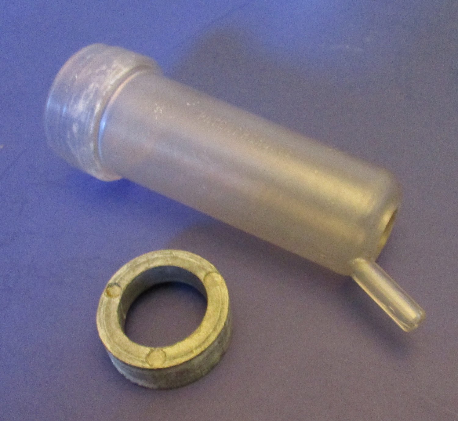 USED This Duncan Visiflow plastic shell is 5 5/8″ long with a 1 5/8″ outer diameter for 4 5/8″, a 2 1/8″ outer diameter for 5/8″ and a 2″ outer diameter for 1/4″. The inner diameter is 1 13/16″, 1 11/16″ and 3/4″. The nipple is 1″ long with a 3/8″ outer diameter and a 3/16″ inner diameter. The metal weight is has a 1 9/16″ outer diameter and inner diameters of 1 13/16″ on one side, a 1 1/4″ inner diameter on the other side and is 5/8″ high. The original Duncan part number is 488-3.