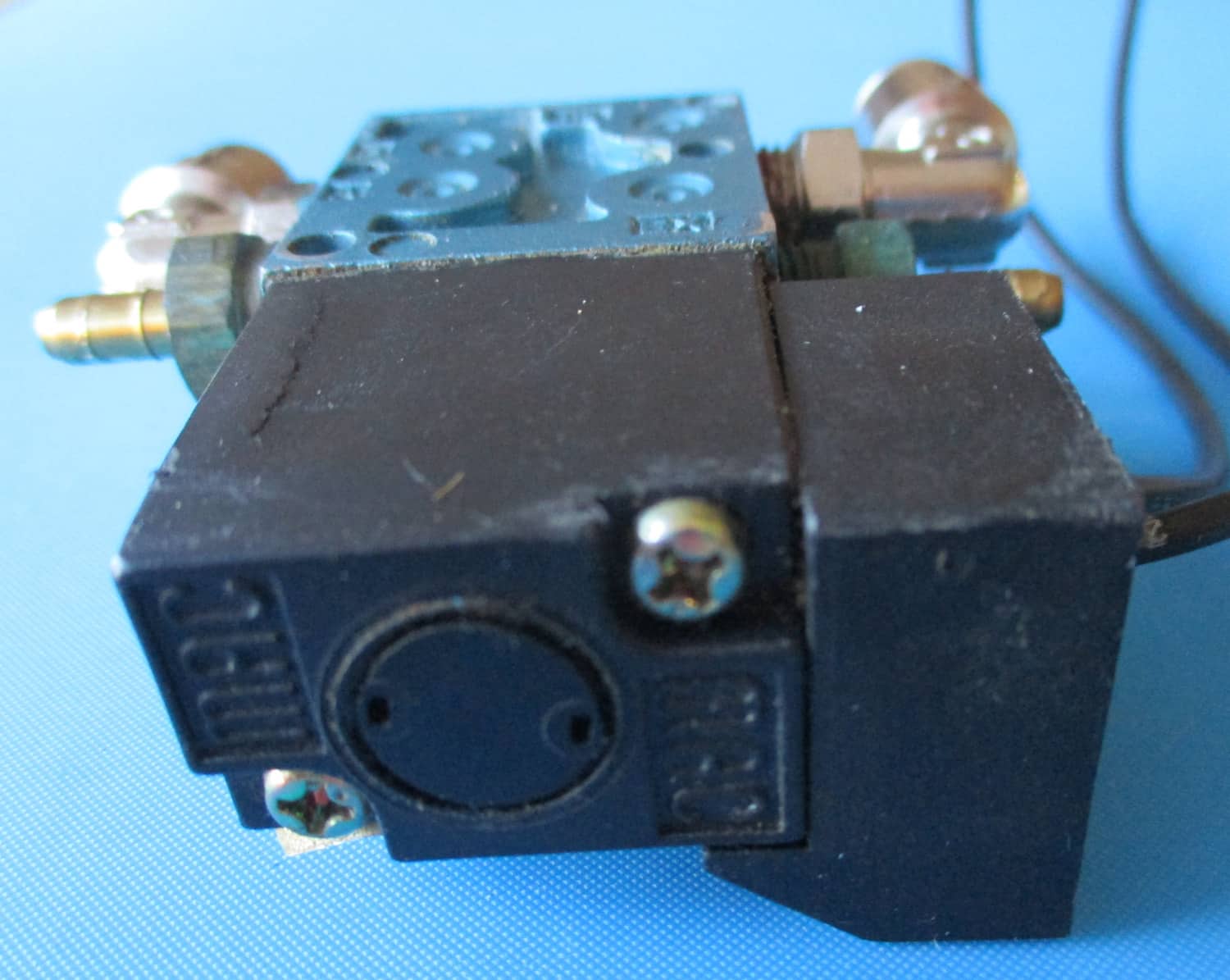 USED This plastic and metal MAC air shift valve is 2 7/16″ long and 1″ high. The plastic body is 1 5/8″ wide and the total width, including the air connectors, is 3″. The brass connectors are 13/16″ long, including the slip-fit barbed nipples. The nipples are 3/8″ long with a 3/16″ outside diameter and a 1/8″ inside diameter. The air connectors are 15/16″ high and 1-1/16″ long with a 1/2″ outside diameter and a 1/4″ inside diameter. The plastic-covered wires are 17 1/2″ long.