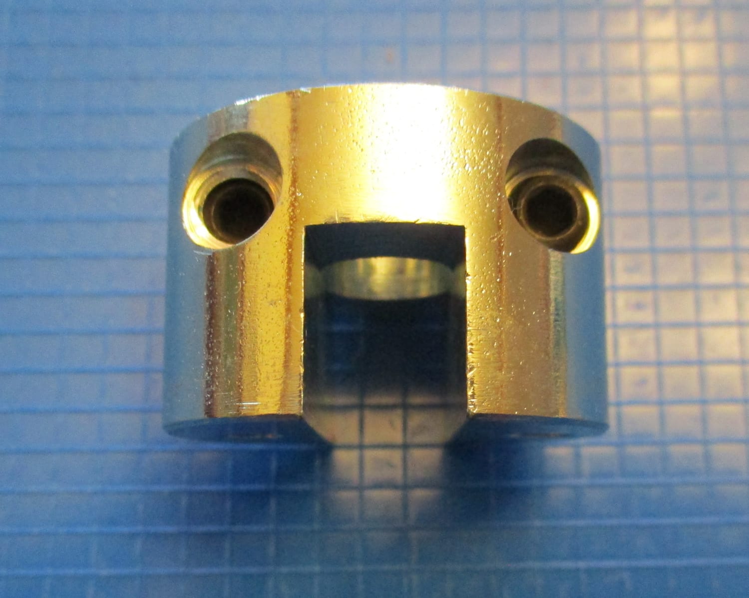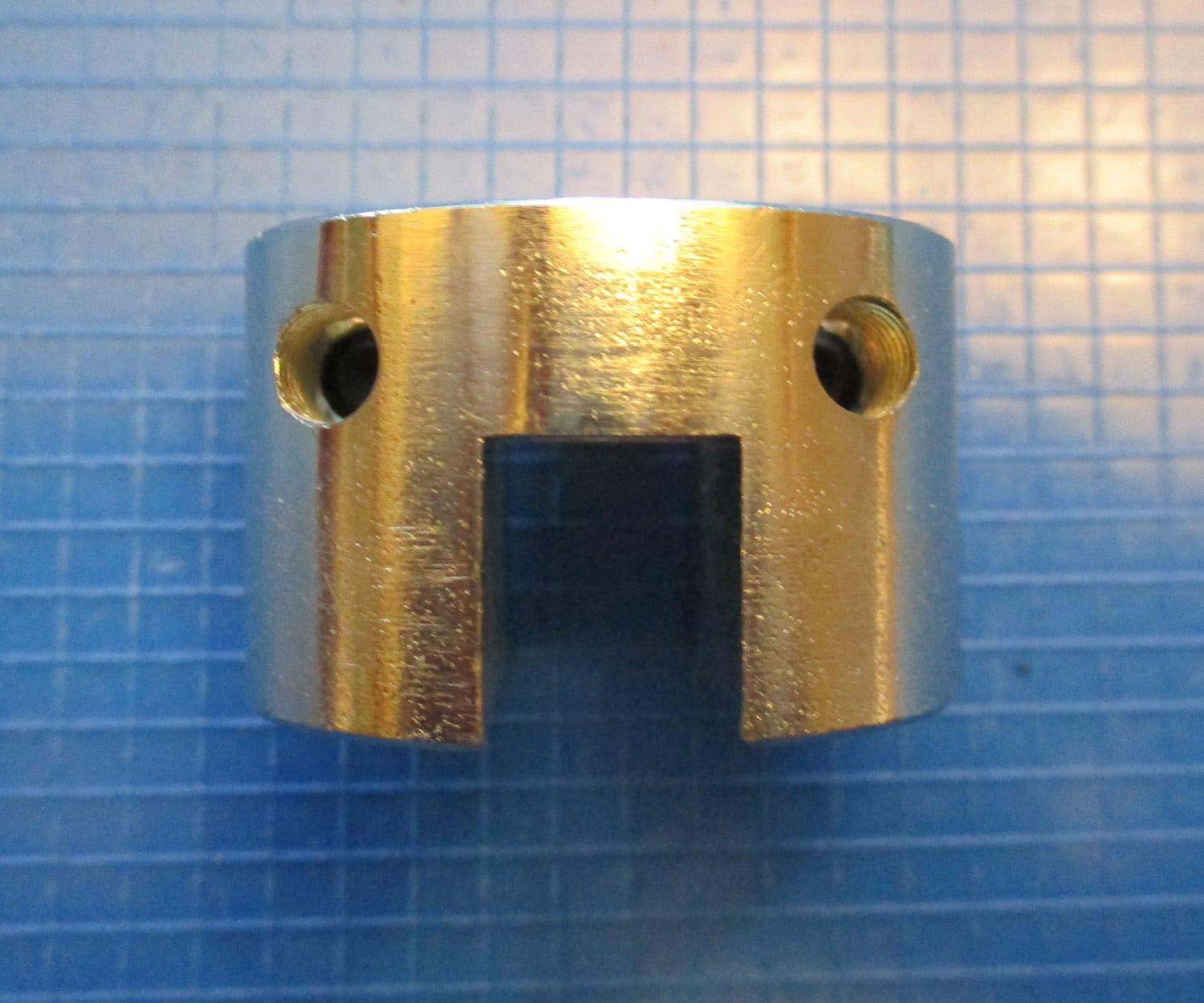 NEW This is a Boumatic spring bushing for a parallel stall.  This part measures 1 3/8” outside diameter by 7/8” height. Center hole 3/8” inside diameter. The two outside holes measure 3/16” inside diameter. The channel is 1/2” deep by 3/8” wide. The two set screws are a metric #3 allen wrench. This part is made of stainless steel. The original Boumatic part number is 8515557.