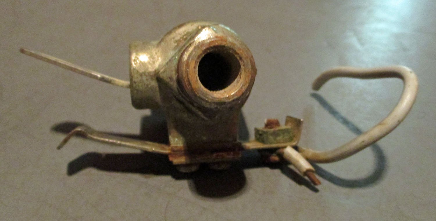 USED This metal, single-shot stallcock part with a contact arm measures, 2 3/8″ high by 3 3/16″ wide overall. The thread has an outer diameter of 5/8″. The DeLaval part number is unknown.