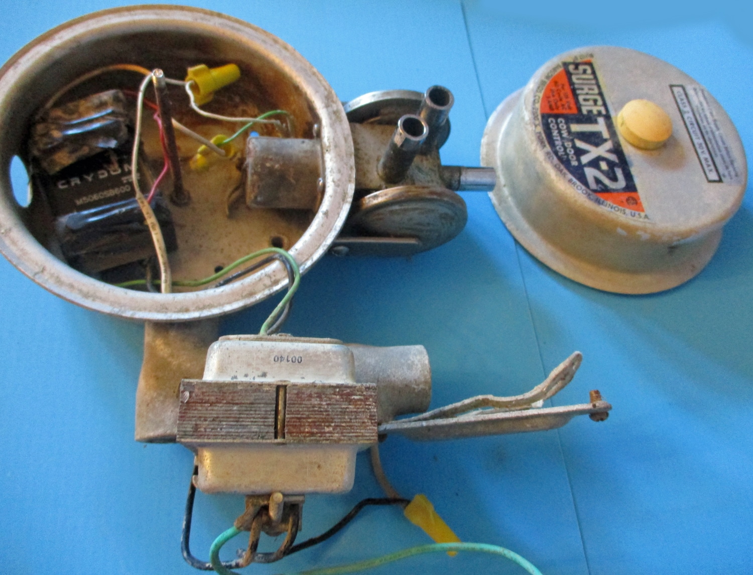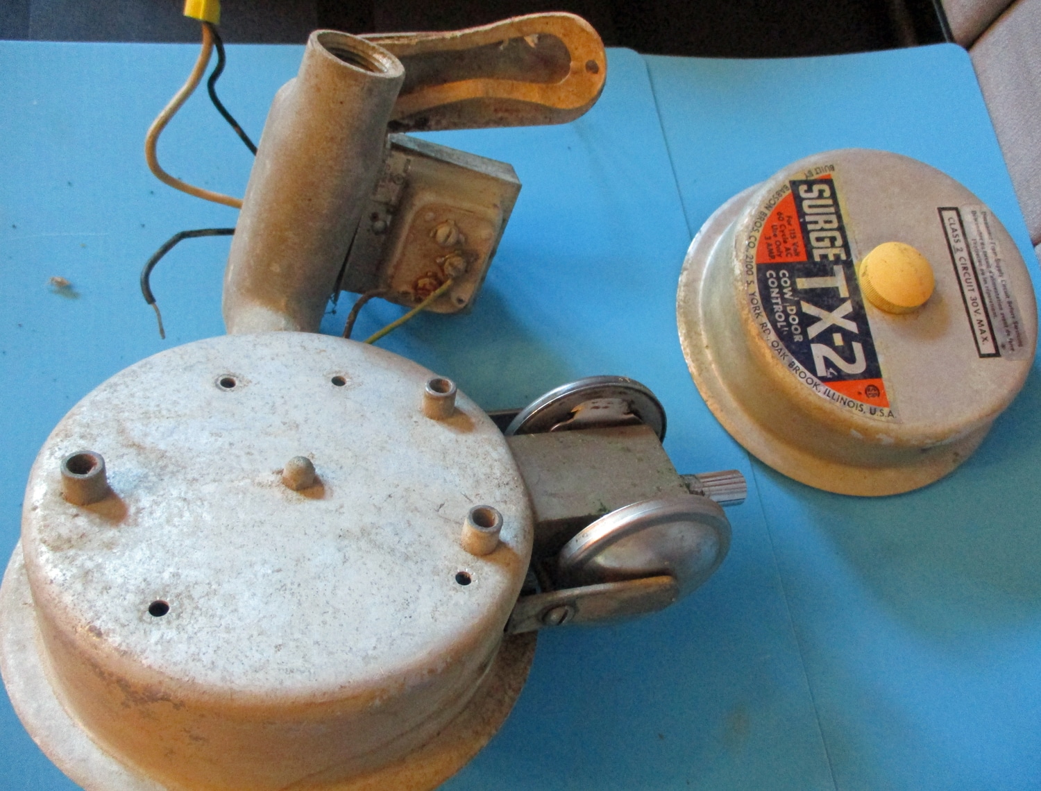 USED This Surge TX-2 cow door control is made of metal, stainless steel and plastic. The length is 9″, width 4 1/2″, and 9 1/4″ tall. The three nipples have an outside diameter of 1/2″ and an inside diameter of 3/8″. Specifications on this cow door control are: class 2 circuit 30 volt maximum. For 115 Volt, 60 cycle alternating current. Use only .3 amperes. This part may be modified from the original version.