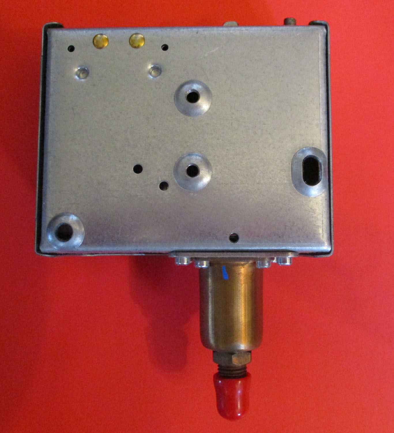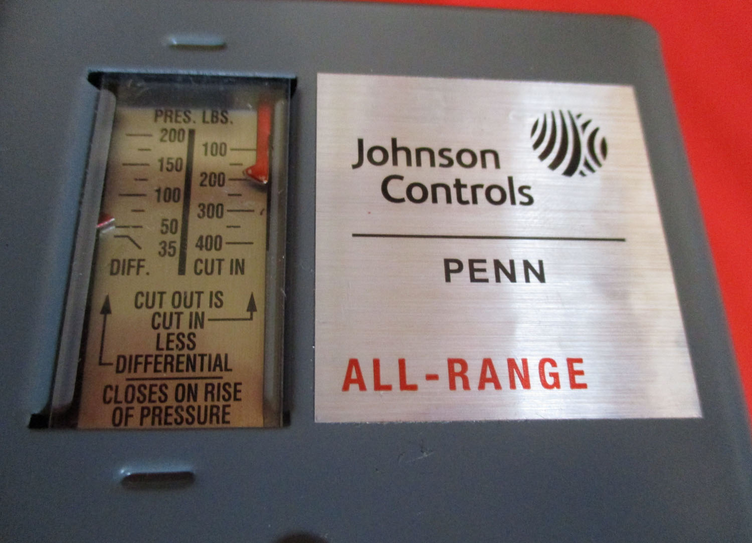 NEW  This is a Johnson Controls high-pressure control switch made of metal and copper.  The switch measures 5 11/16″ overall, with the main body being 3 1/4″ tall by 3 15/16″ wide by 2 1/16″ deep.  The copper probe mount is 2 1/16″ long and has an outer diameter of 15/16″.  The threaded section of this mount is 3/8″ long with an outer diameter of 7/16″, with the thread size being M12-1.5.  The hole on the bottom has an inner diameter of 7/8″.  The mounting bracket measures 5 3/4″ tall by 3 1/2″ wide by 2″ deep.  The large holes on the back and bottom of this bracket have an inner diameter of 7/8″.  The ten small holes on the bottom have an inner diameter of 3/6″.  The slots four large on the bottom are 11/16″ long and 5/16″ wide, and the small slots are 3/8″ long and 5/16″ wide.