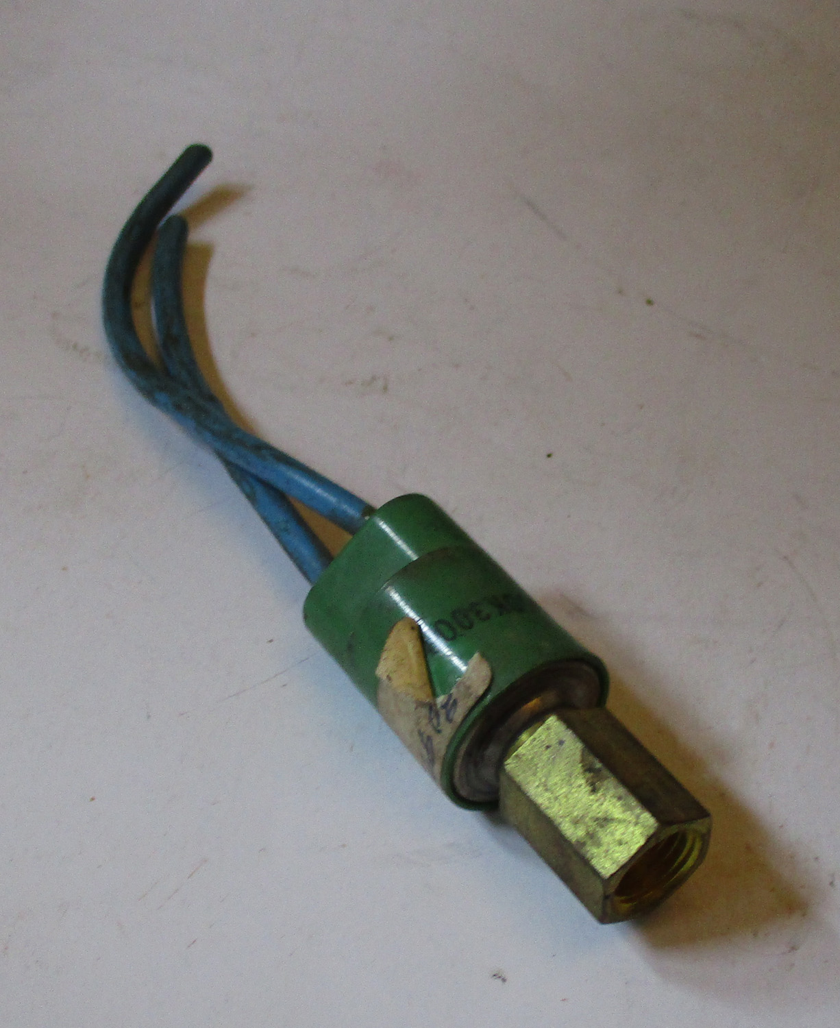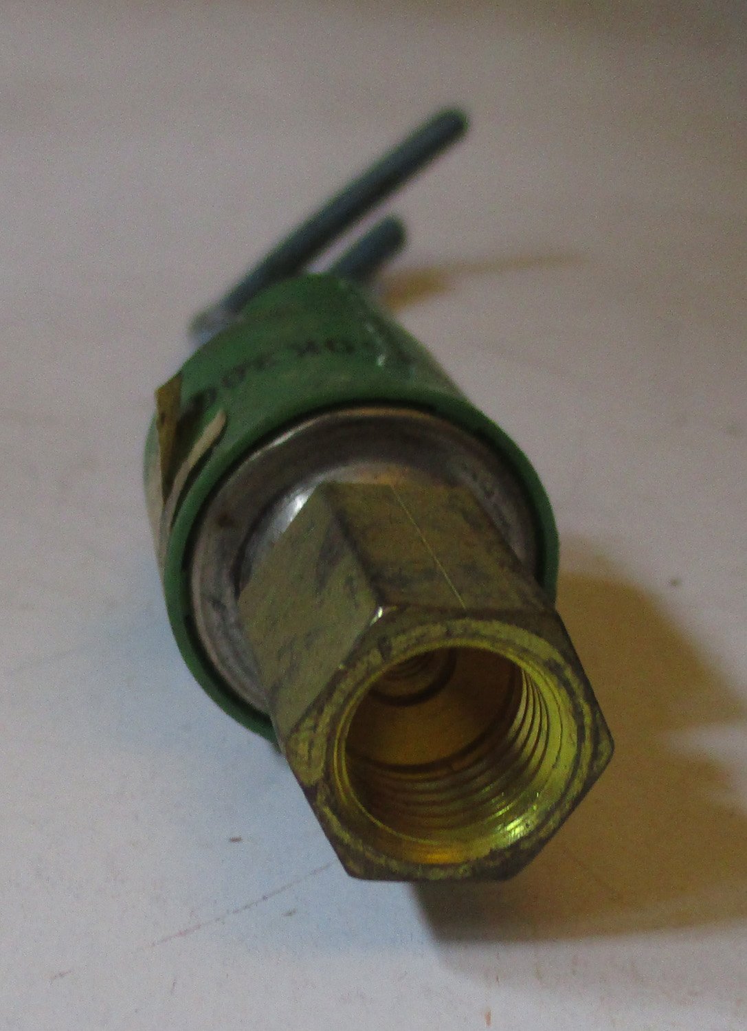NEW This plastic, metal, and brass pressure switch is 2 1/2″ long. The brass end has a 9/16″ outer diameter with a 3/8″ threaded inner diameter and is 3/4″ long. The green section is 1 1/4″ long and has a 7/8″ outer diameter. The lower section is 7/8″ by 1/2″. The plastic-covered wires are 4 5/8″ and 3 5/8″ long. The original Schlueter part number is 30972.