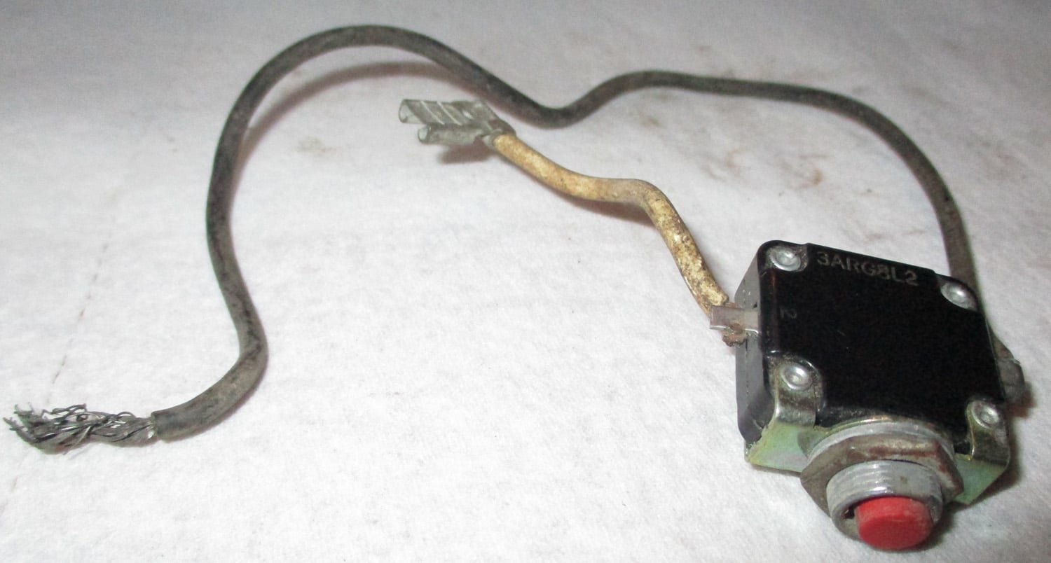 USED This Hard Brown Plastic Push Button Switch (Old Style) is 1-1/8″ long by 7/16″ wide by 1″ high. The Red Button is 1/4″ high by 1/4″ diameter. A 3/8″ panel hole is needed to attach the switch to the panel, the nut is included. The copper leads are 10″ long (black) and 2″ long (white).