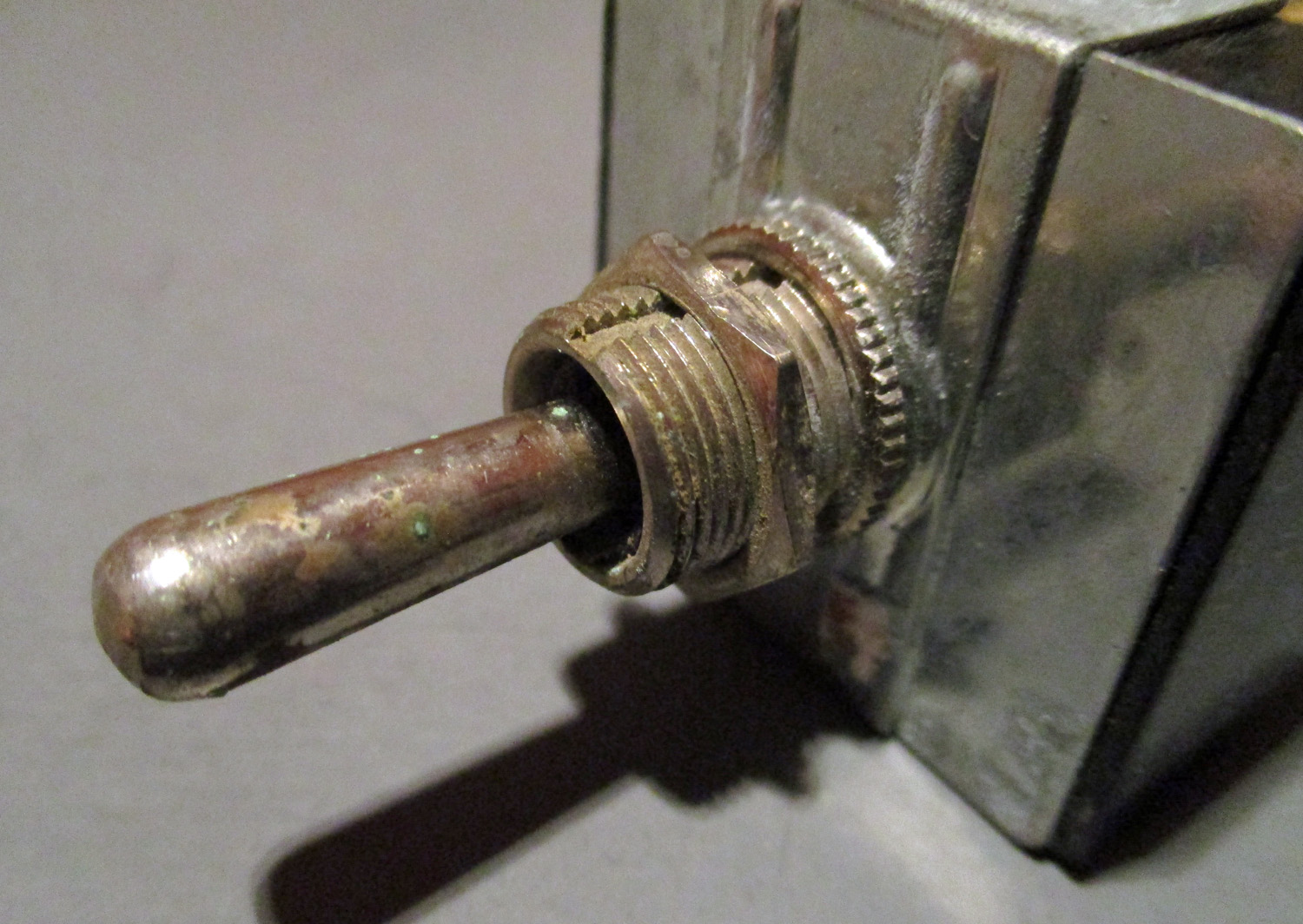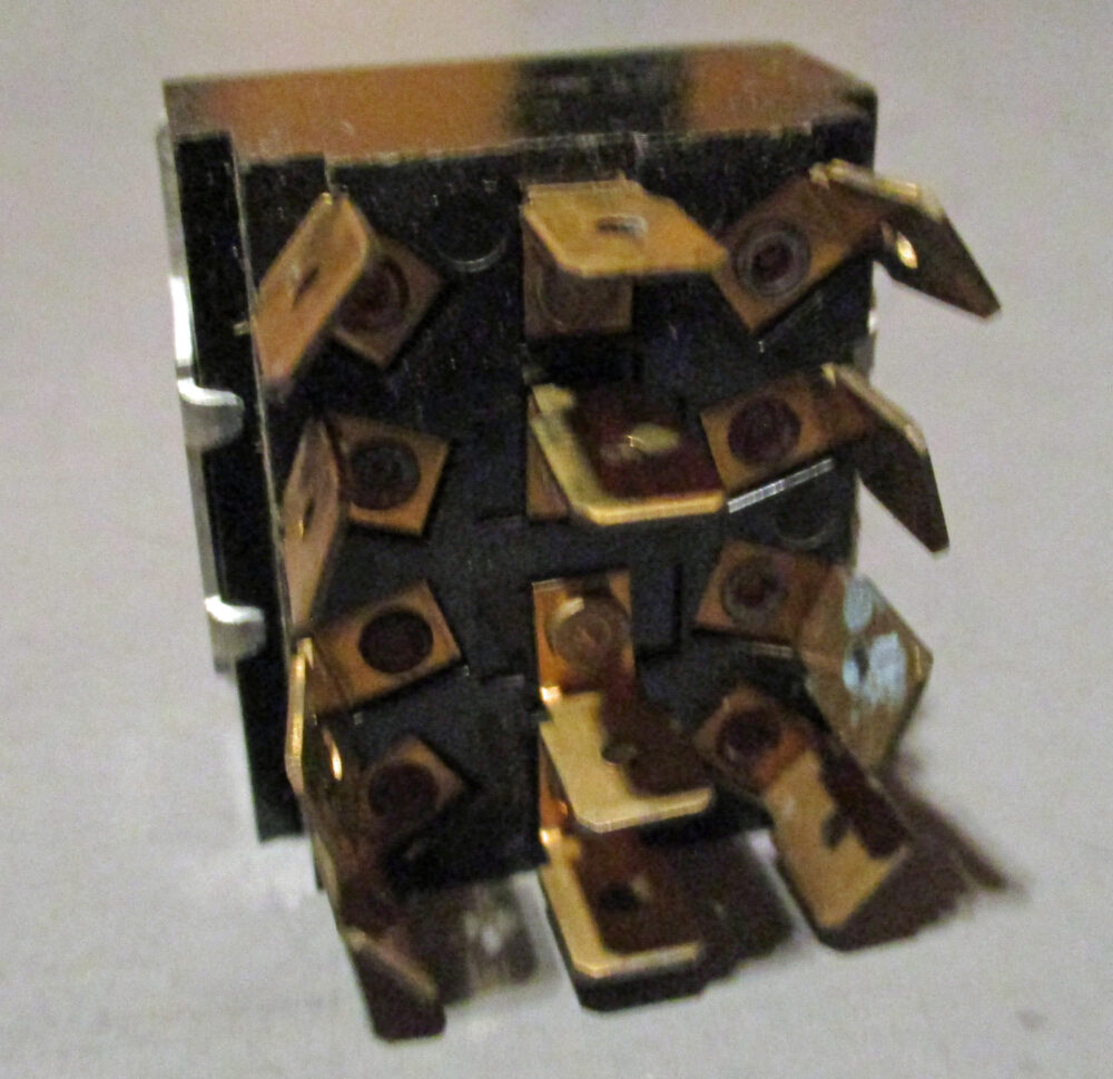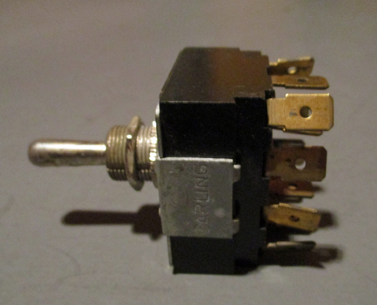 USED This plastic and metal, four-pole double throw, center stop toggle switch measures: