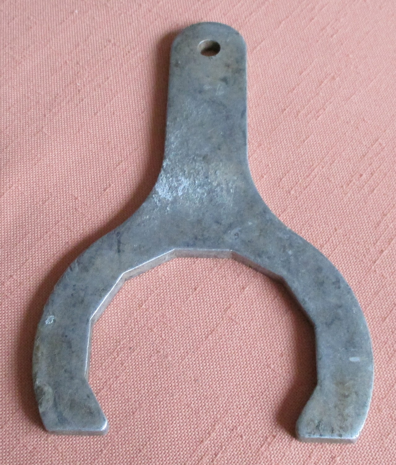 USED  This DeLaval metal tank wrench is 7 5/8″ long, 4 3/4′ wide, and 1/4″ thick. The opening on the end is 2 1/2′ wide and the inside width is 3 3/16″.