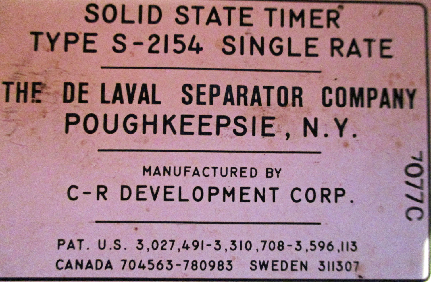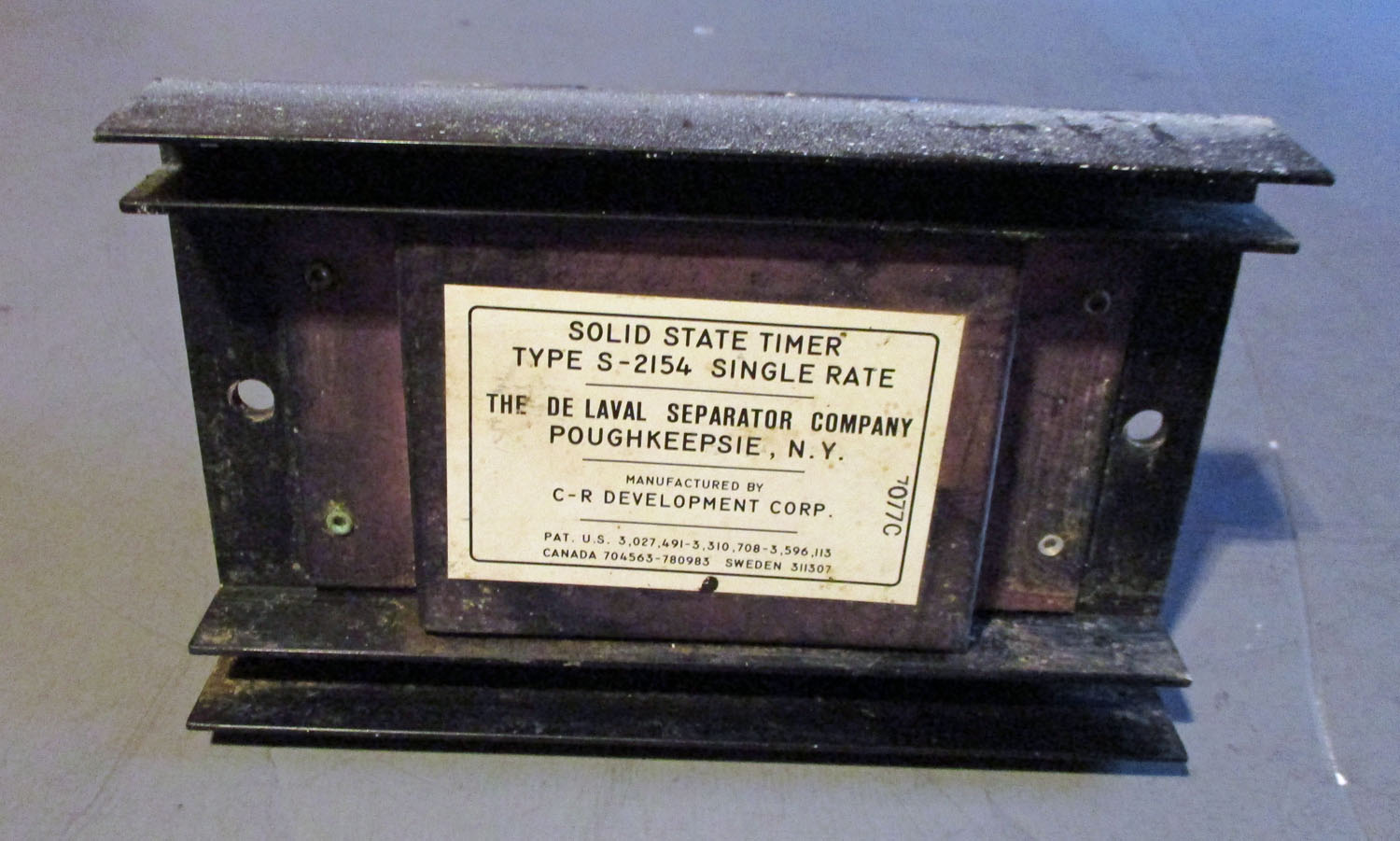 USED This metal solid-state type S-2154 single rate timer measures: 6 1/2″ long by 4″ wide by 3 1/8″ high overall. The timer has not been tested. The DeLaval part number is unknown.
