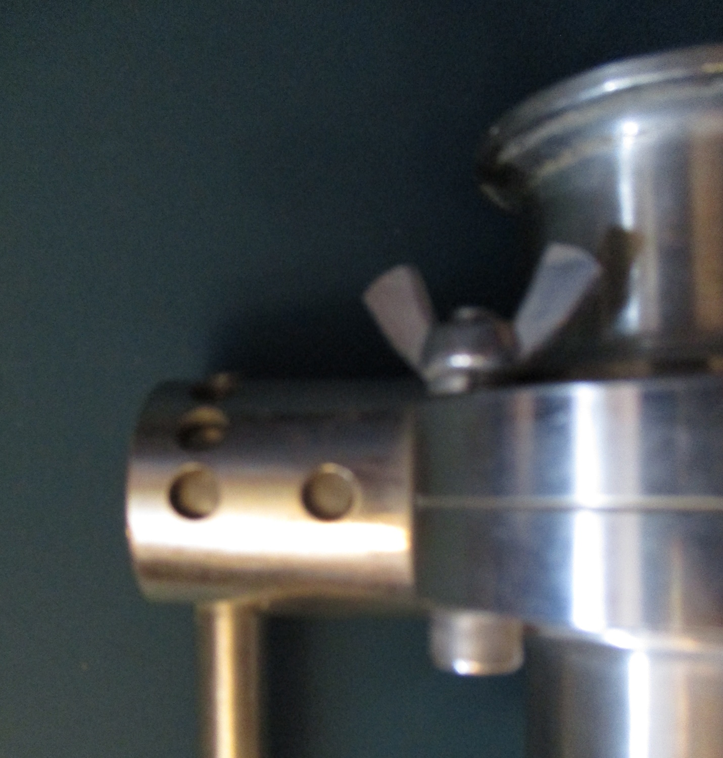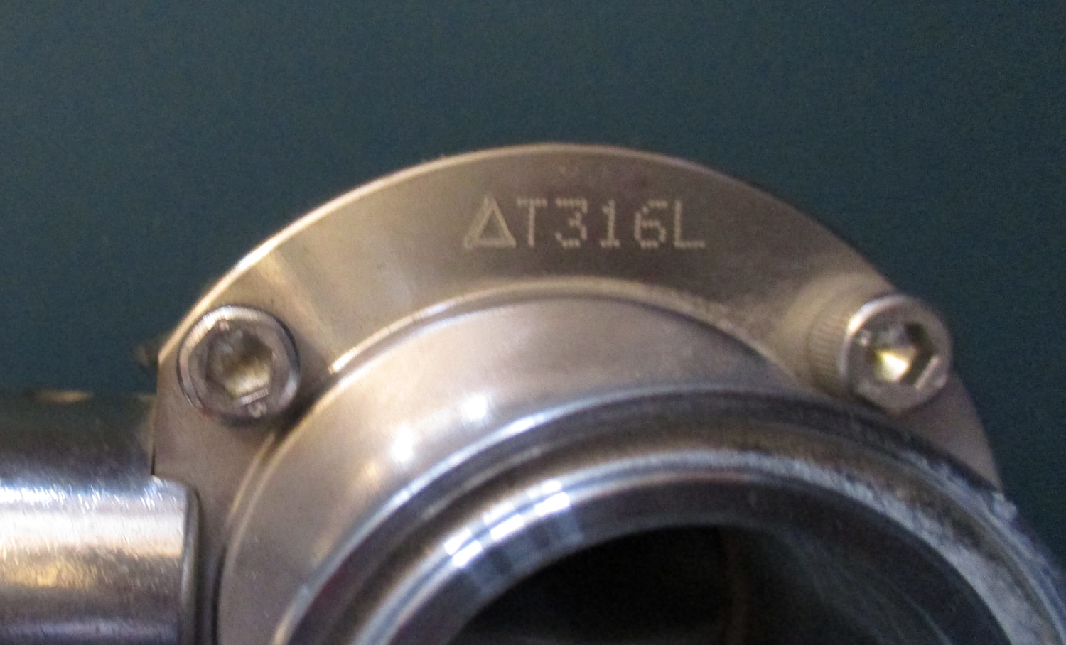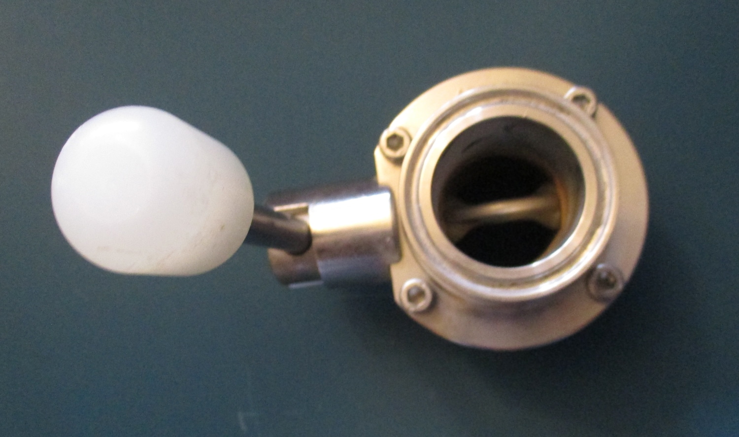 USED This stainless steel butterfly valve has a plastic spring loaded handle for adjusting the valve opening. There are 4 adjustable closures. The pipe outside diameter is 1 1/2″. Each stem measures 1 1/4″ long and has a tri-clover ferrule end. The overall height of the unit is 6 3/4″. The handle length is 4 1/2″ long. The inscribed number on the unit T316L.