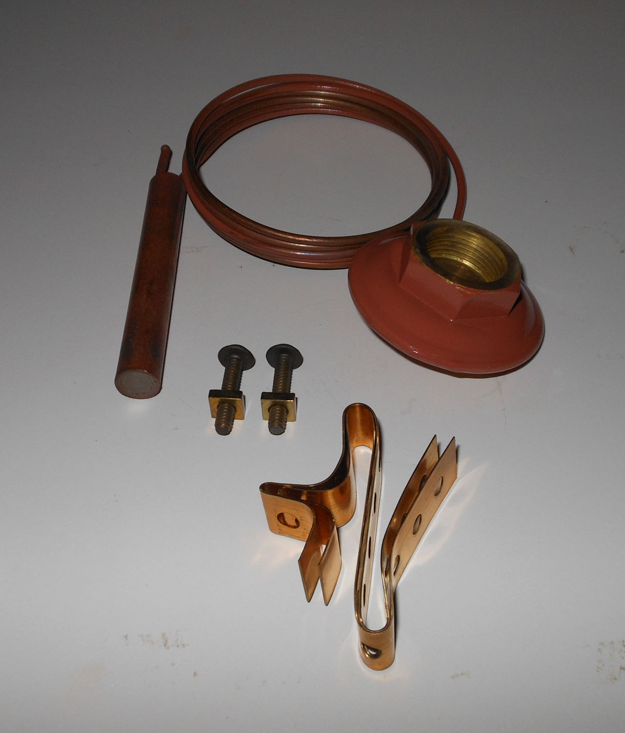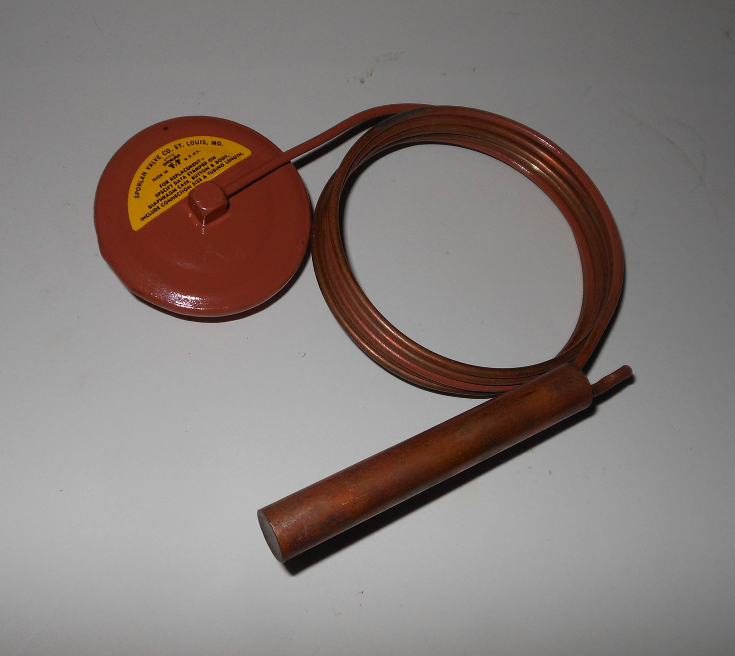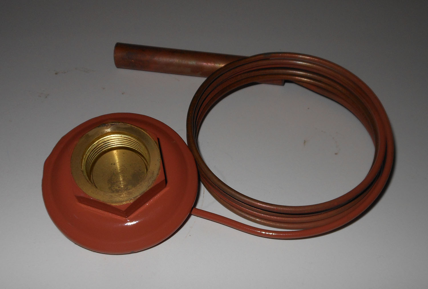 NEW This thermal expansion valve measures as follows: about 56″ long, for the end piece 3 1/2″ long, outer diameter for the lid 2 1/4″, hexagonal part on lid 2 3/8″ wide with an inner diameter of 15/16″, round head screw 1 1/8″ long with a 1″ thread length, #10-24 thread size, clamps 2 1/2″ by 1 1/4″. It is made of ceramic, metal and copper. The Sporlan manufactuer number is 8484580KT-83-FCP50.