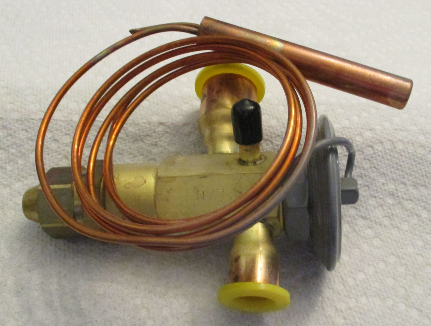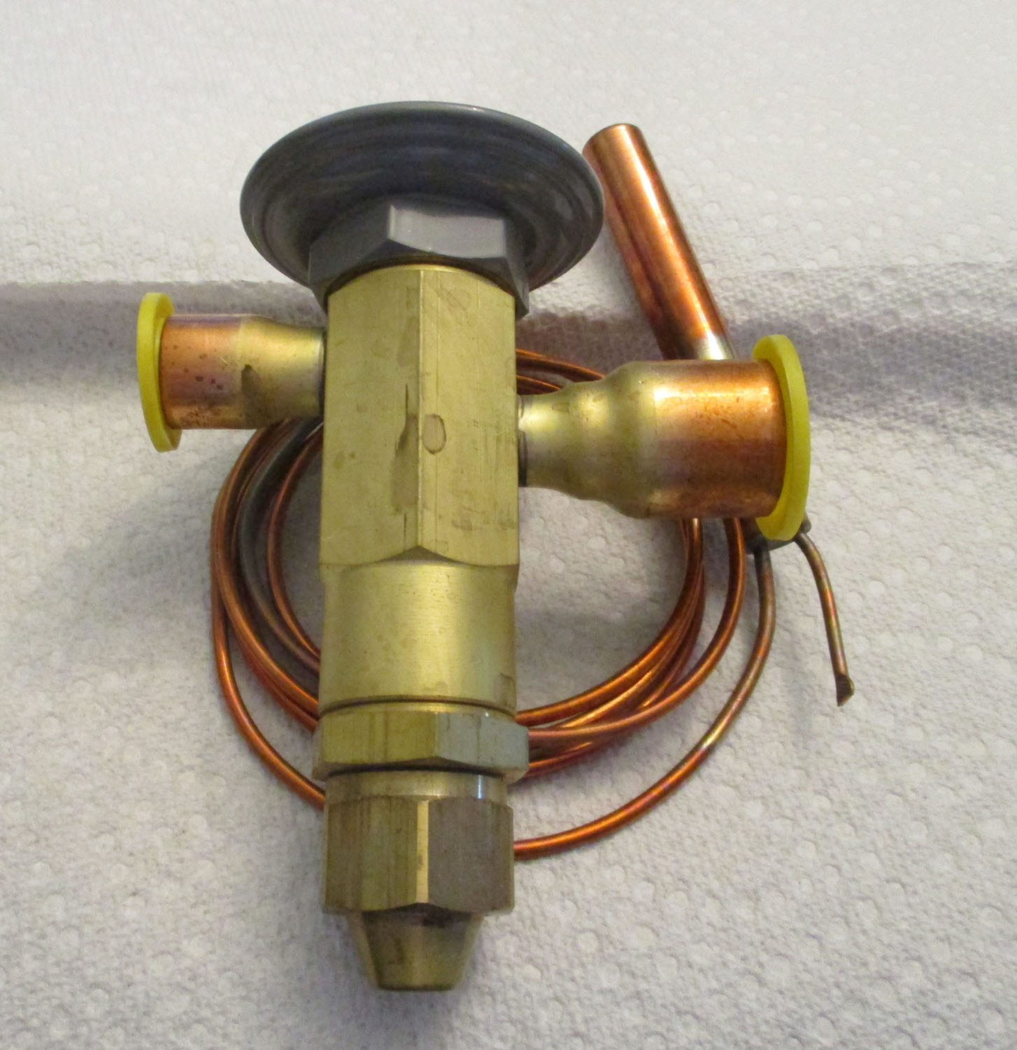 NEW This R22 thermostatic expansion valve 10-Ton, 5/8″ by 7/8″ ODF solder, is made of brass, copper, and plastic. The measurements are: